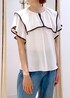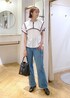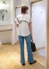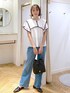 サラッとしたブラウス×デニムの夏の鉄板コーデです! 大きめラッフルが華やかで存在感があるので、デニムと合わせてもカジュアルになりすぎず大人女子にオススメです◎