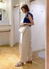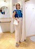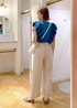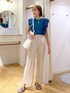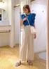 パッと目を引くブルーのトップスで大人女子のデートコーデです! 小物は女性らしいアイテムで! 敢えてパンツと合わせて甘過ぎないスタイリングにしたのがポイント⭐︎