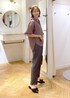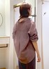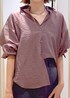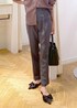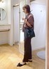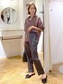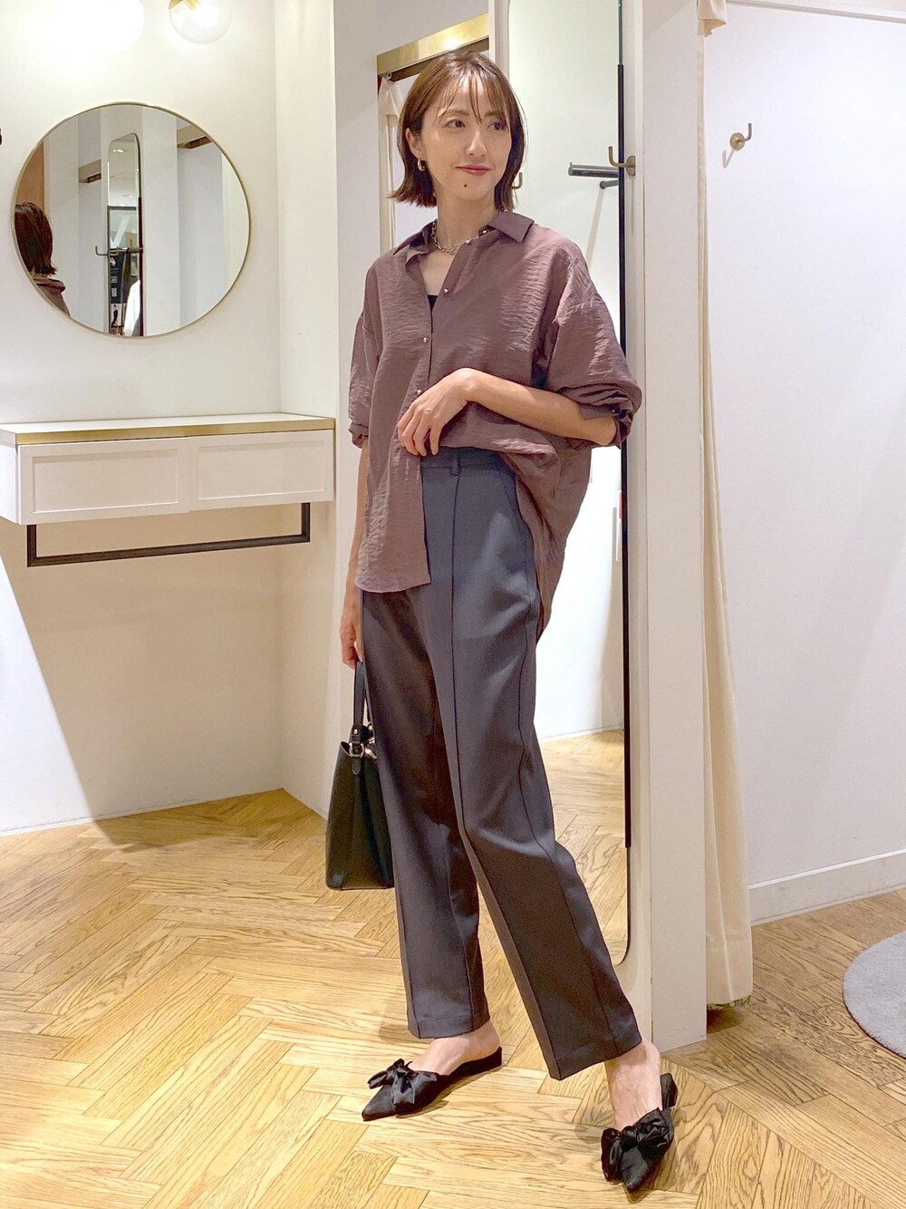 ブラウンシャツ×チャコールパンツの通勤スタイルです! 少し襟を抜いてゆるっと着る事で大人の余裕と女性らしさをプラス⭐︎