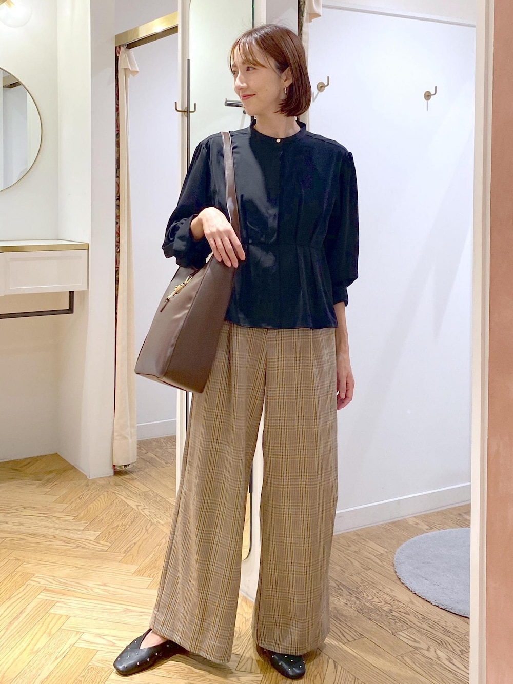 大人気のウエストタックブラウスに秋らしいチェックのワイドパンツを合わせた秋のお仕事コーデです! トレンドのホーボーバッグを合わせれば一気に今年顔に⭐︎