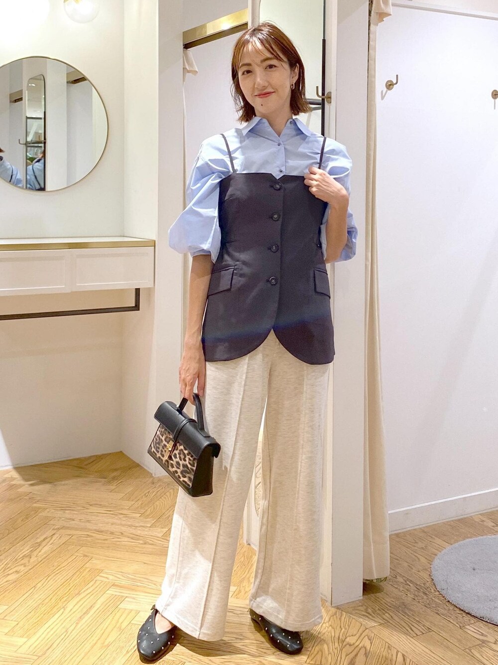 トレンドのキャミビスチェに楽ちんなスウェットパンツを合わせたレイヤードコーデです! カジュアルになりすぎないようにインナーにシャツを合わせて大人っぽくしたのがポイント⭐︎