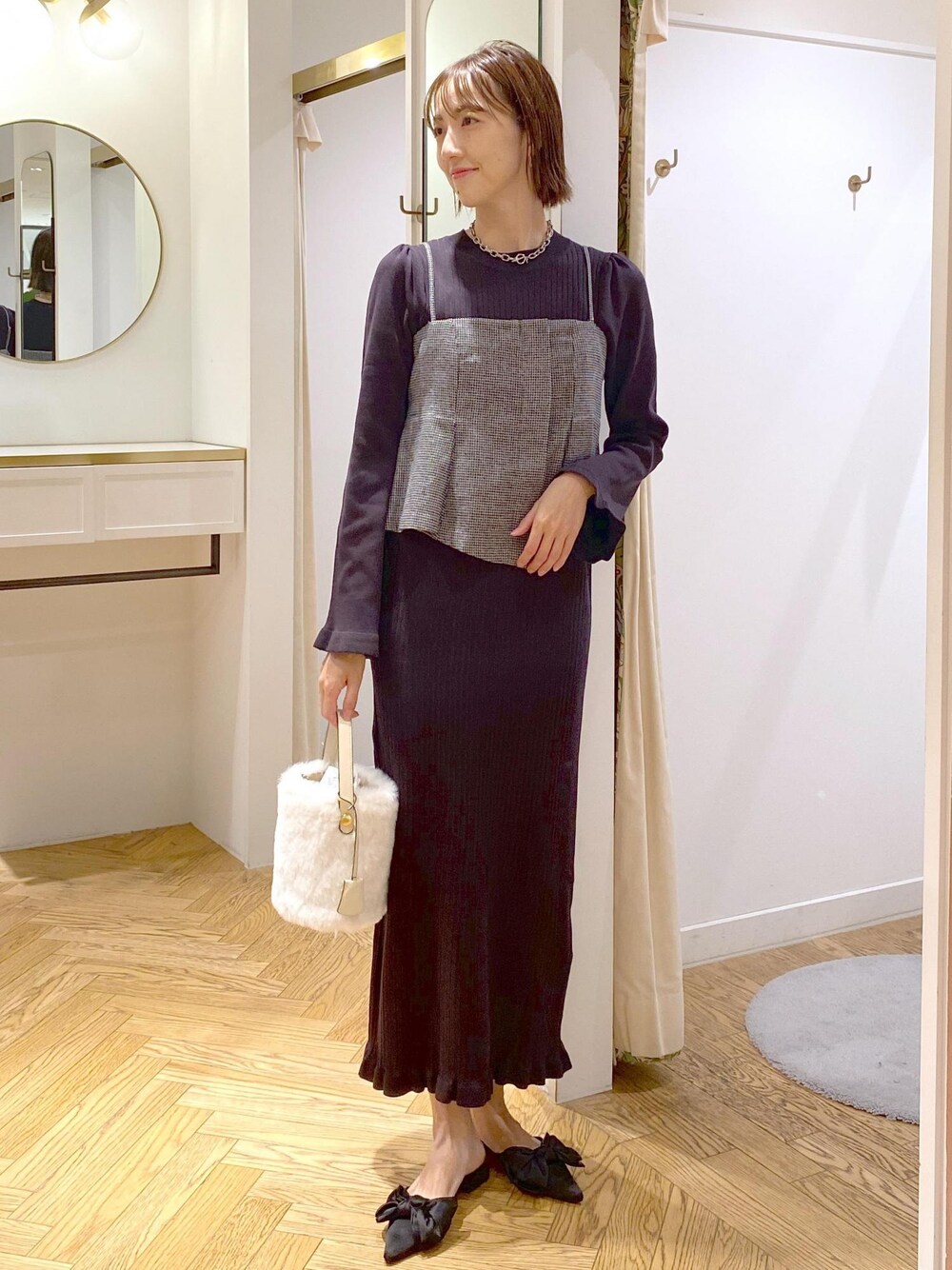 ビスチェとセットのワンピースが主役のスタイリングです! ファーバッグにリボンミュールでちょっとしたお出かけや女子会にも◎