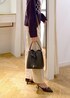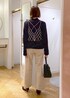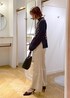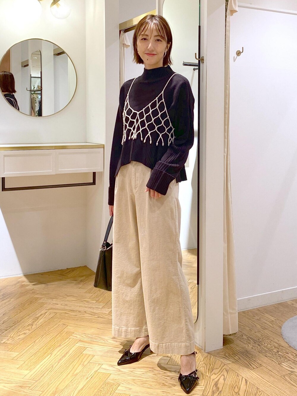 ベーシックな黒ニットは、パールビスチェを合わせるだけで一気に今年っぽさがアップ!! カジュアルになりすぎないように足元はパンプスで抜け感を◎