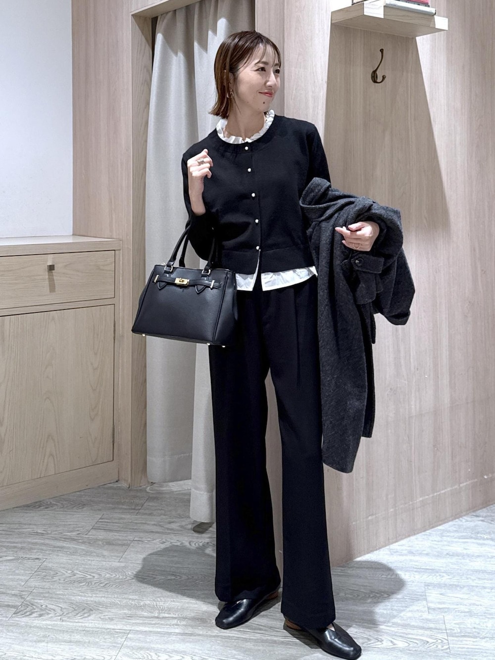 フリルドッキングトップスに黒のスラックスを合わせたキレイめオフィスコーデです! 上下黒でも裾のフリルが間に入る事で少し軽い印象に♪ きちんとバッグを合わせればセレモニーにも着回せます◎ *記載のない物は本人私物です ********************* コーディネートご覧いただきありがとうございます⭐︎ 是非お気に入り♡登録していただけると嬉しいです! 気になる方はコーディネートはフォローしていただくと【お気に入り】タブからご覧頂きやすくなります!! 《 Instagram &WEARも更新中!》 どちらもフォローしていただけると嬉しいです♡ ・WEAR @eric08 ▶︎Instagramではプライベートや日常も投稿しています♡ 是非チェック&フォローお願いします♪