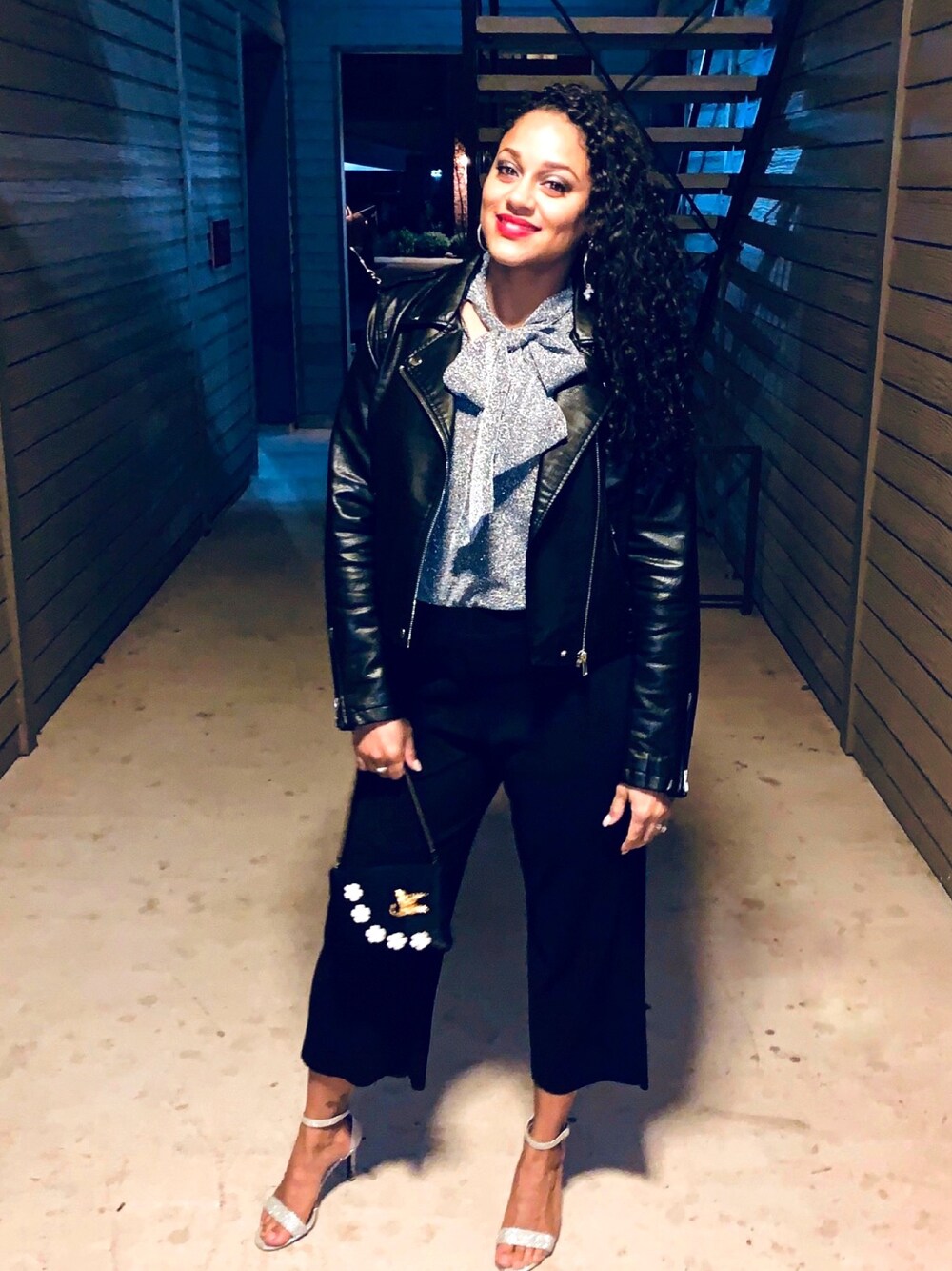 シルバー系のシャツ/ブラウスを着用したレディースの冬コーディネートの1枚目の写真