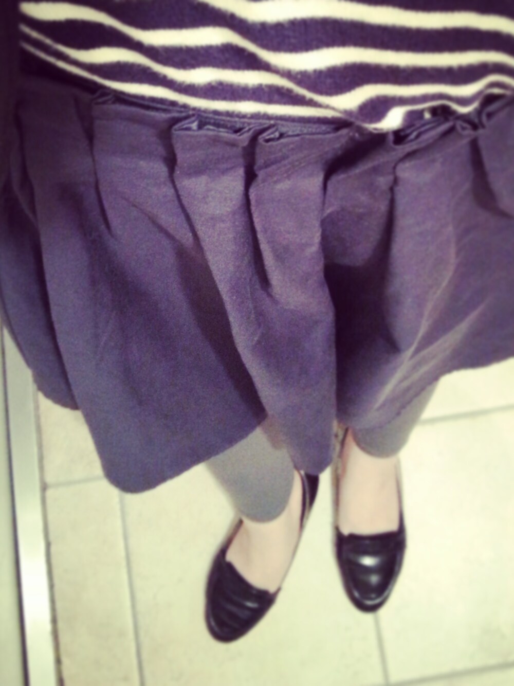 着やすくてどんな時も安心のスタイル◎ ネイビーに白ラインのボーダーシャツ。 ネイビースカートにイン。 グレーのレギンス。 黒のローファー。 ボーダートップス→無印良品 スカート→earth music&ecology ローファー→Talbot