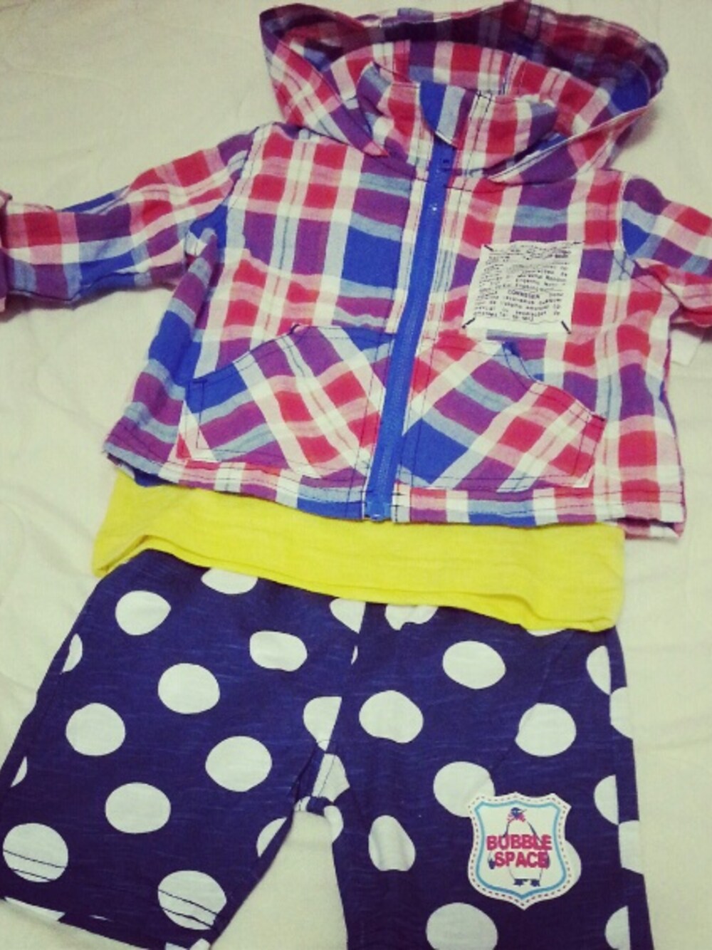 3ヶ月の甥っ子にプレゼント。 ほんとは70だけど、ハーフパンツと半袖、七分だから80で大きめに! 中のTシャツ: 1680円 little bear club ハーフパンツ: 780円 topvalu ジャンパー: 1980円 全部イオンで購入!