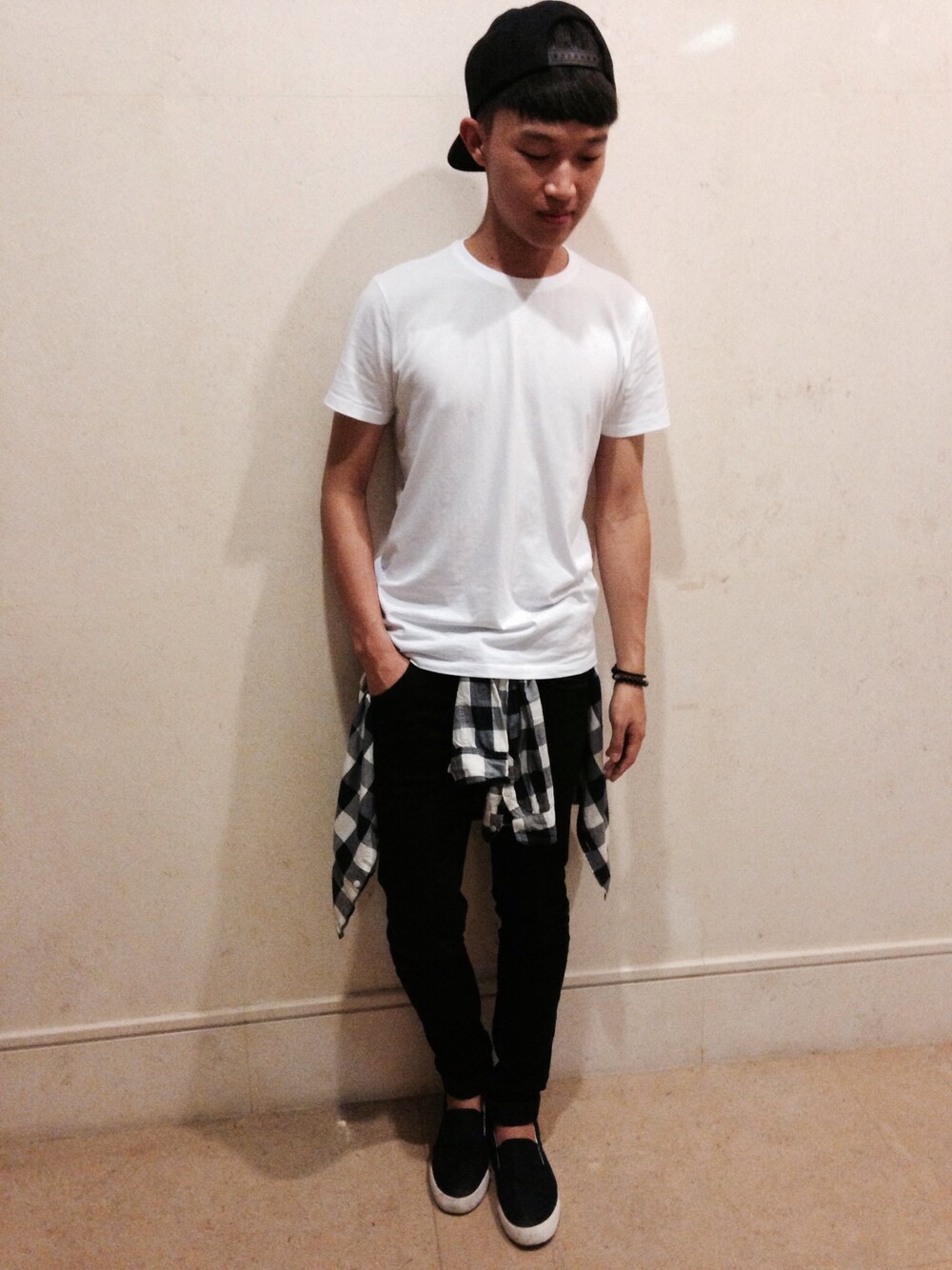 Hat:STAMPD T-shirt:ZARA Shirt:ZARA Pants:ZARA Shoes:Global Work Bracelet:Chrome Hearts, Bottega Veneta