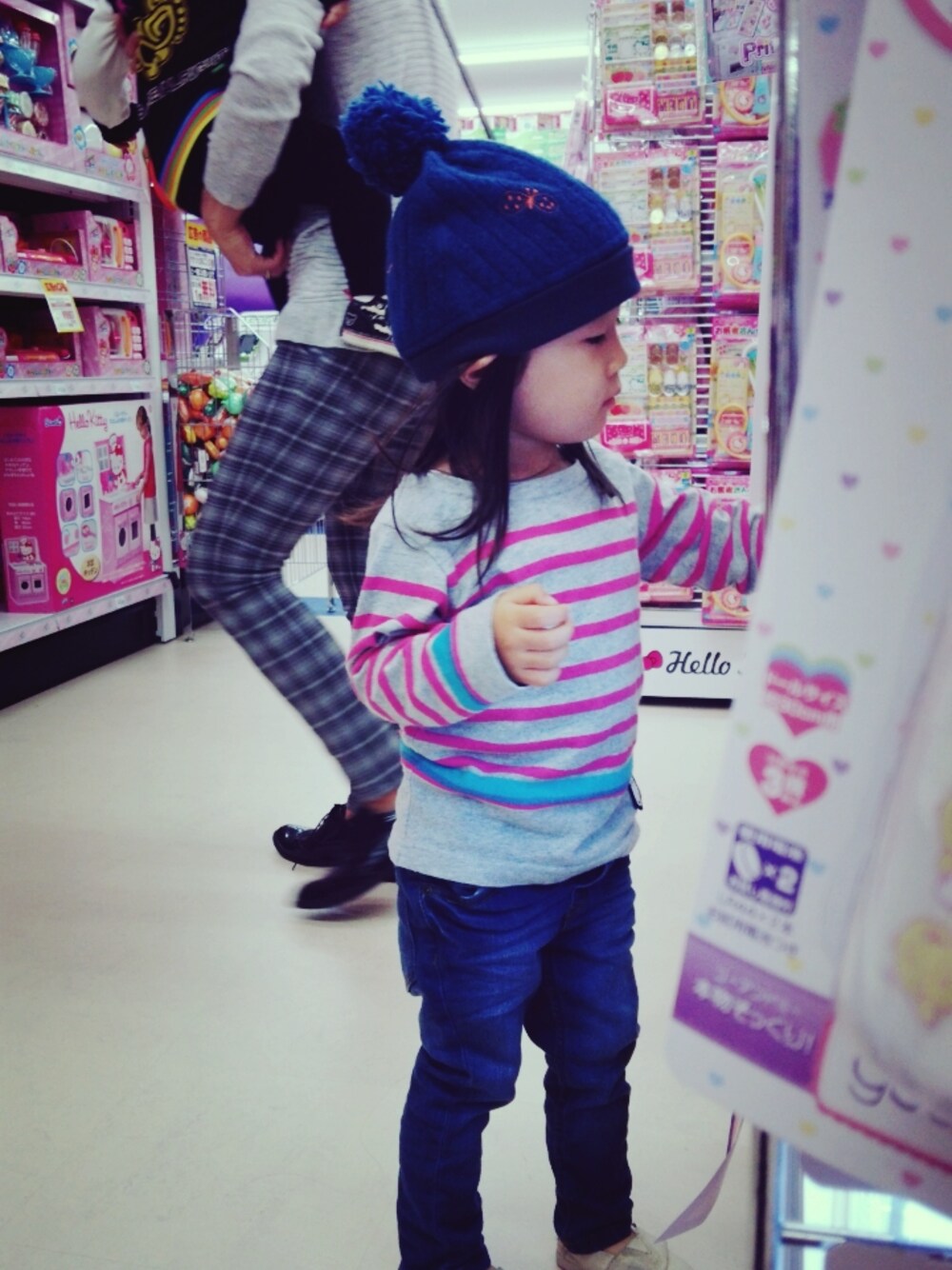 台風きてるけど車でお出かけ♪ 大好きなトイザラスでパパと遊んでる間にママはお買い物♪ 早く帰らなきゃ~ ニット帽:mina perhonen トップス:B'MING