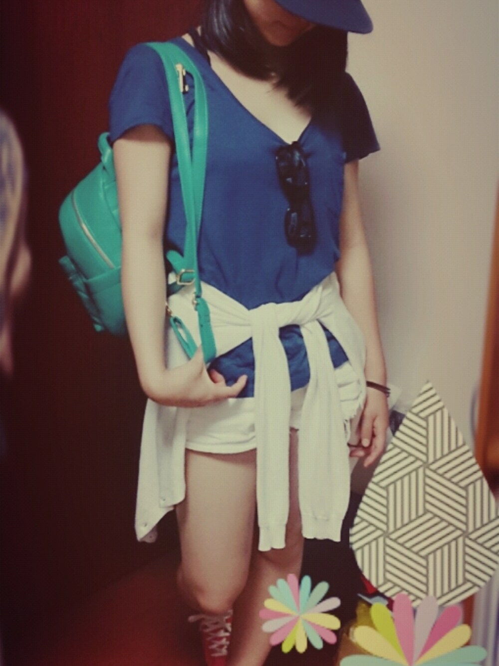 ピンク系のスニーカー、ブルー系のキャップ、ブラック系のサングラスを着用したレディースの夏コーディネートの1枚目の写真