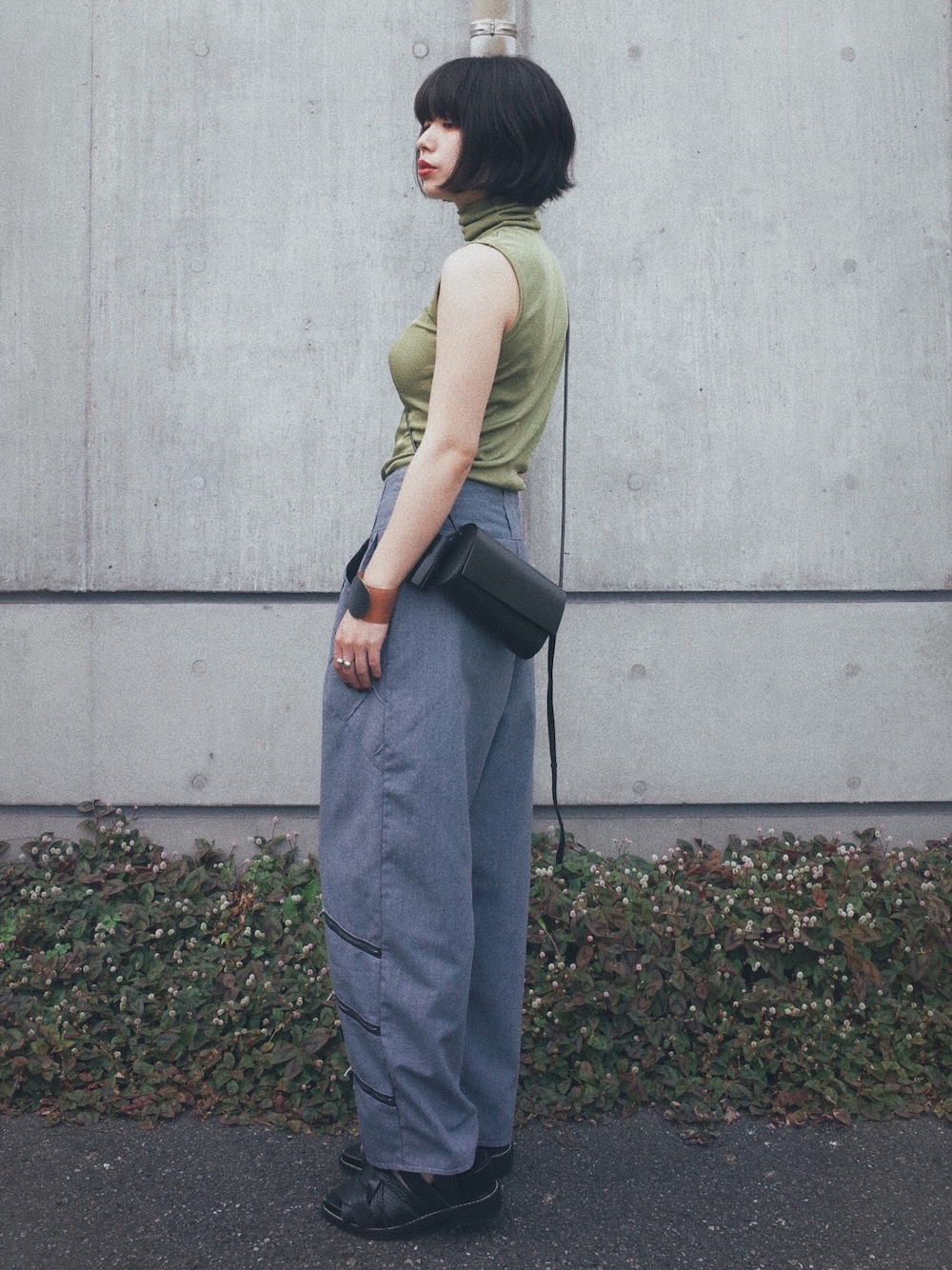 ぴたっとしたトップスには ついボリュームのあるボトムスを合わせたくなる グレイッシュなグリーンとブルーのコンビ