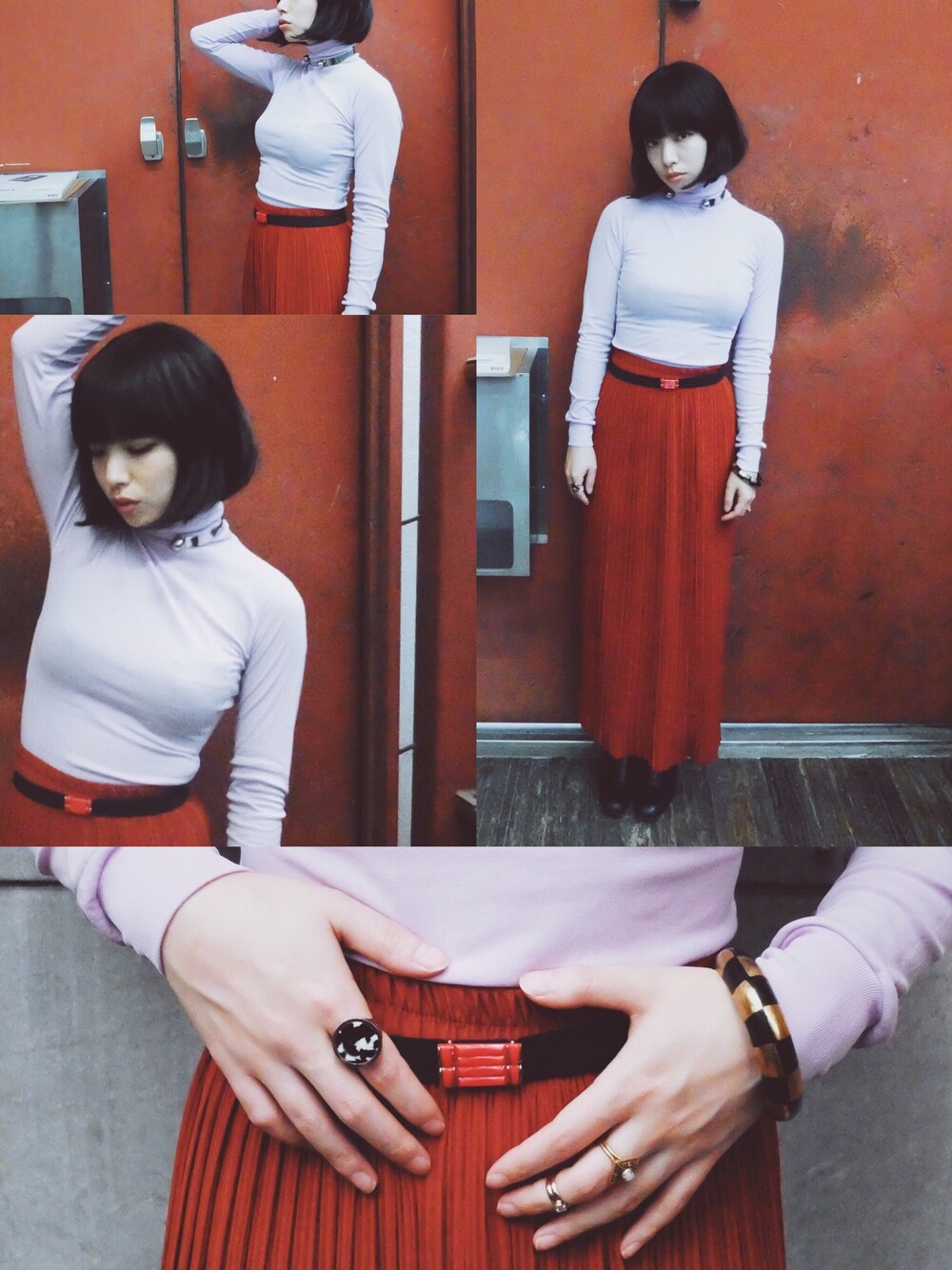 デッドストックカットソー、秋冬バージョンはこのタートルネック。GERMAN DEAD STOCK TEEの次はこれ❗️80年代後半のものと推測。一枚一枚袋に入った状態で発見されました。 伸縮性が抜群で、肌に馴染むしっとりとした質感。 洗濯してすぐ乾いてくれるところ最高好き😏❤️ なんと20色のカラーバリエーションがあります。うふふ。 私はひとまずこのライラックを買いましたが、もうタイトなのに柔らかくてとても気持ちがいい。可愛すぎる…‼️もうすぐZOZOにも入荷するのでお楽しみにです😍 レンガ色のプリーツスカート合わせて、 こちらもZOZOに入荷したてホヤホヤのベルトと、再入荷して即ソールドアウトしてしまったスージーリングでちょっとミステリアスな味付け。 こういう小物のパワーはすごい。 何でもない上下の組み合わせも、小物でいかようにも大きく変えられる。 たのしい。