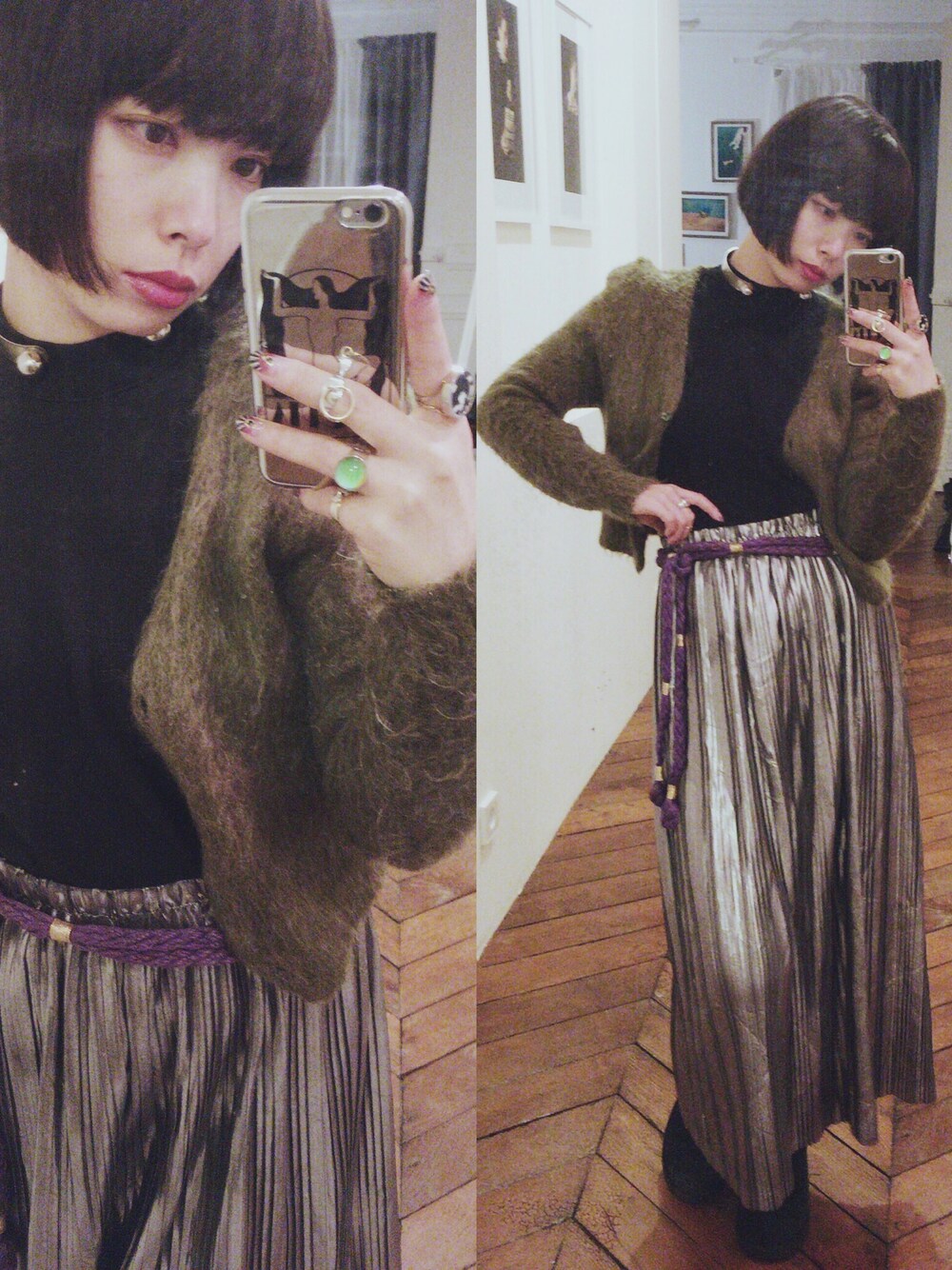 パリ2日目 あるものの中で組み合わせて着るのは 難しいけどちょっと楽しい 深いグリーンの70年代のノースリーブ カーキ色のモヘアカーディガン パープルの縄ベルト 銀色のスカート という色あわせ 足元はさっむいので ヒートテックの上にカシミヤパンツを重ねて、 ムートンブーツ履いたら無敵でした ☃☃☃☃☃☃☃