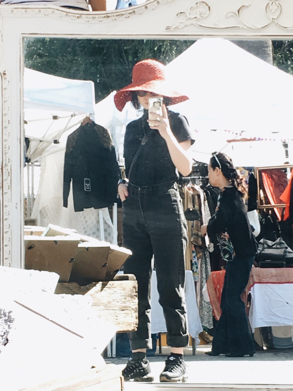 蚤の市セルフィー このアメリカ出張のために 赤いつば広麦わら帽子を この赤! すごいいい赤!! しなやかで、スーツケースに放り込んでもOK しっかり陽射しから守ってくれました 赤い帽子っていいな💋💋💋