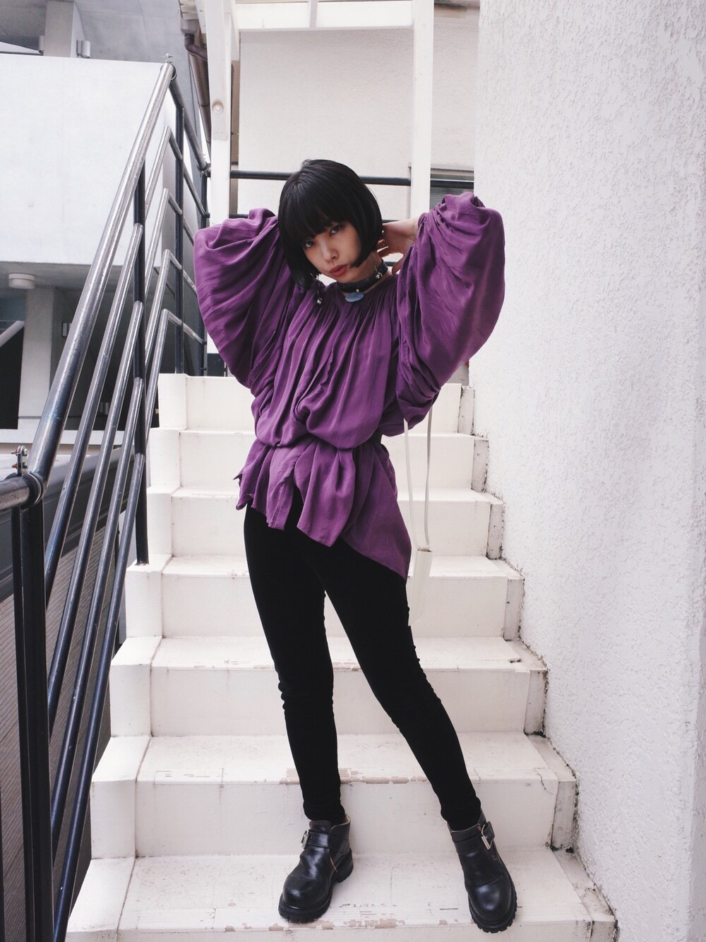 ずっと持ってる80sのシルクドレス これでもかってくらいタックとギャザーがたっぷり 🍇🍇🍇🍇🍇🍇🍇 少し肌寒いのでmotherのでNOMAパンツを