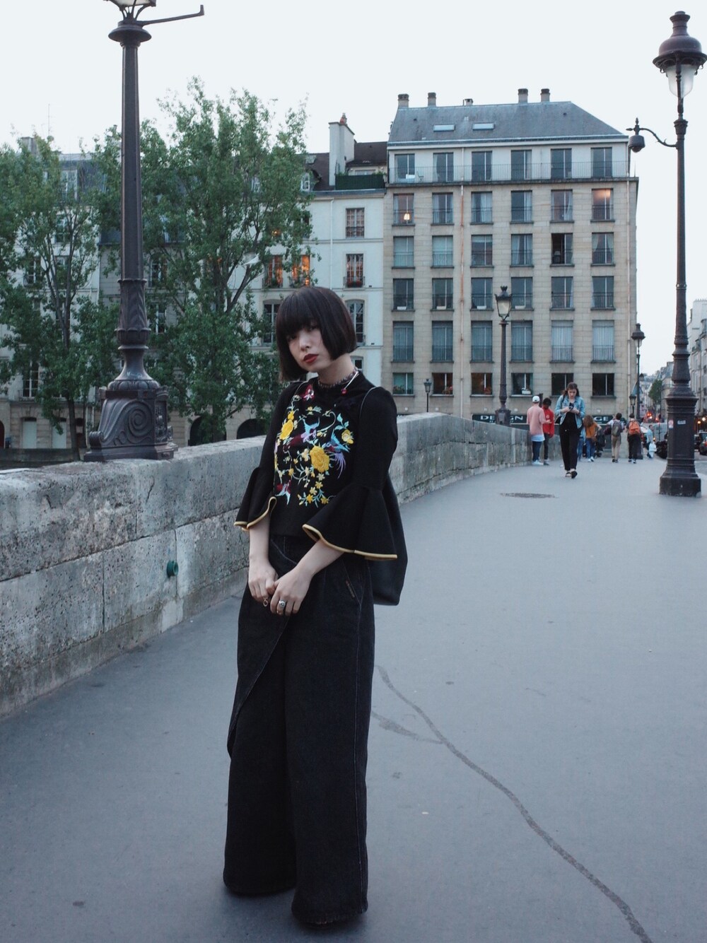 シルクの刺繍をキメたブラウスはmotherの新作。初秋に出す予定だったのだけど、私は気温の低いパリに行くので一足先に着ていきました。 😍😚🤗 袖がぷりぷりして可愛いんだ