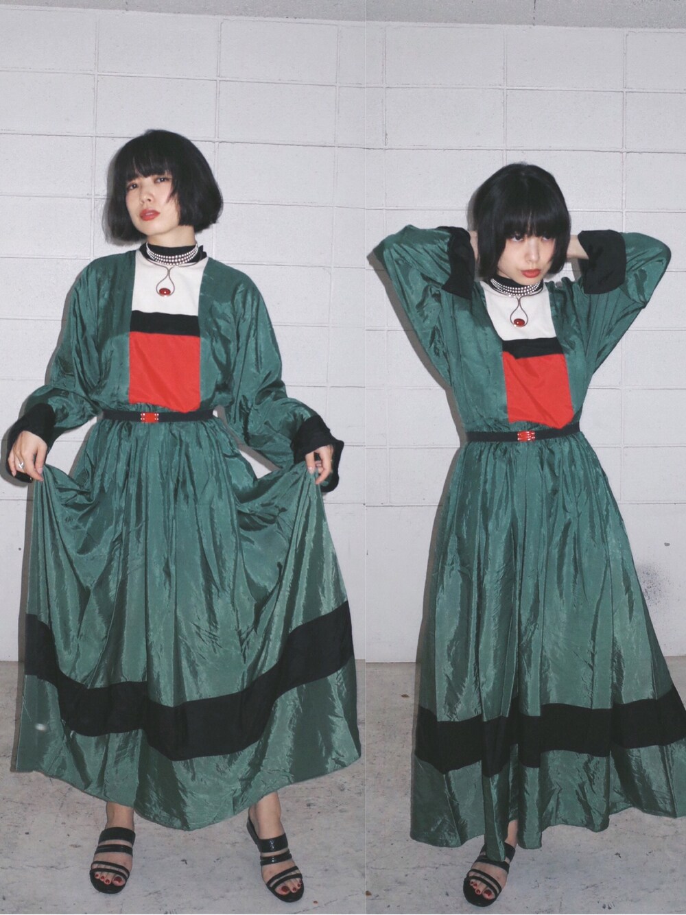 随分前に買い付けでみつけた グリーンのシルクドレス 昨日に引き続き気温が読めずシルク頼み。 長袖でもちょうどよかった! なんか祈祷とかしそうな雰囲気。 ネックレス、今日は2つだけ。