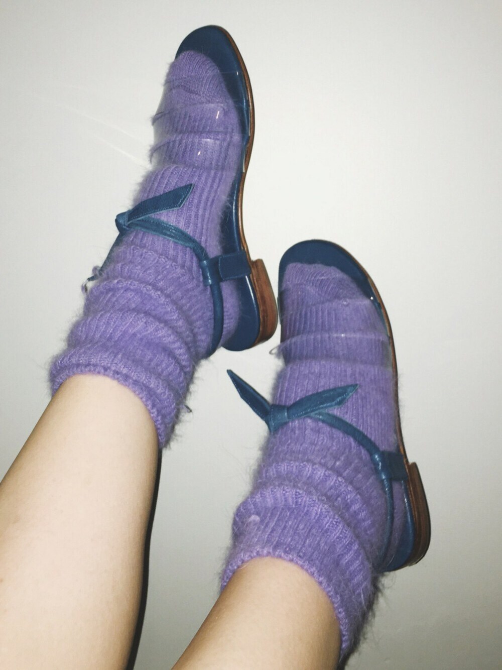ラベンダーのアンゴラソックスに クリアPVCの組み合わせいいなぁ 異素材のコンビネーション モヘア・アンゴラ系ソックスてほんとにかわいいねぇ このカラーも発色良く毛足もあって気に入っている
