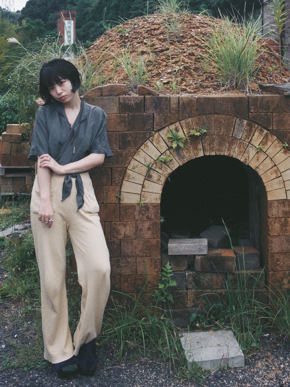 古窯とわたし、 うちかけのシルクブラウスにニットパンツ。 やや青みがかったグレーって 合わせやすくて好き 出張なので楽な格好 だけど だらんとしすぎないように 靴下屋さんのお気に入り光沢ソックスの グリーンにサンダルのブルーで 色味をプラス➕