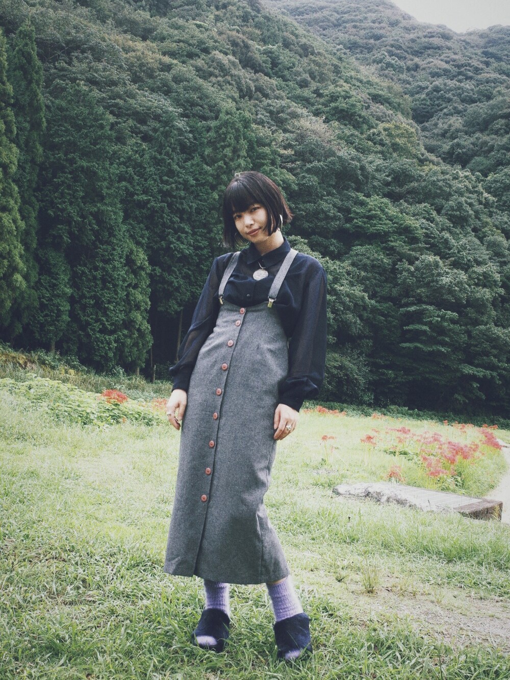 彼岸花があちこちに咲き誇ってました 武雄〜波佐見町近辺 吊りワンピース(スカート)はヨーロッパ80年代、 中のシースルーブラウスは90年代。 重ね着に適した2枚の組み合わせ!