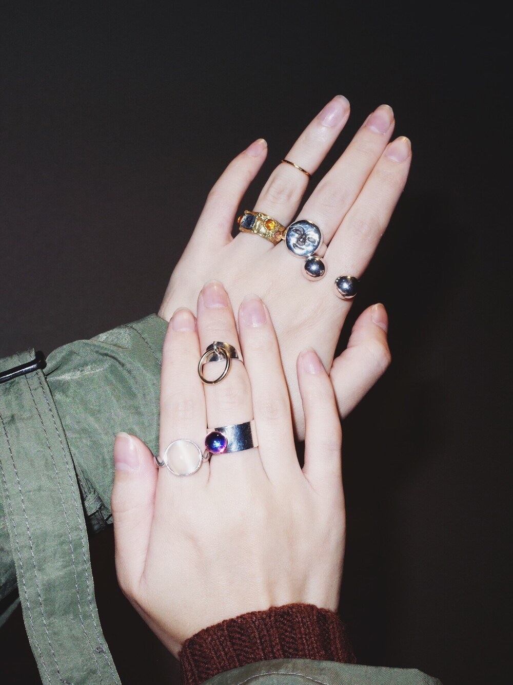 指輪、指輪、指輪、、 こうやってみると、位置とか、 種類とか、 細いの混ぜたり、 その日の気分が出てて面白い