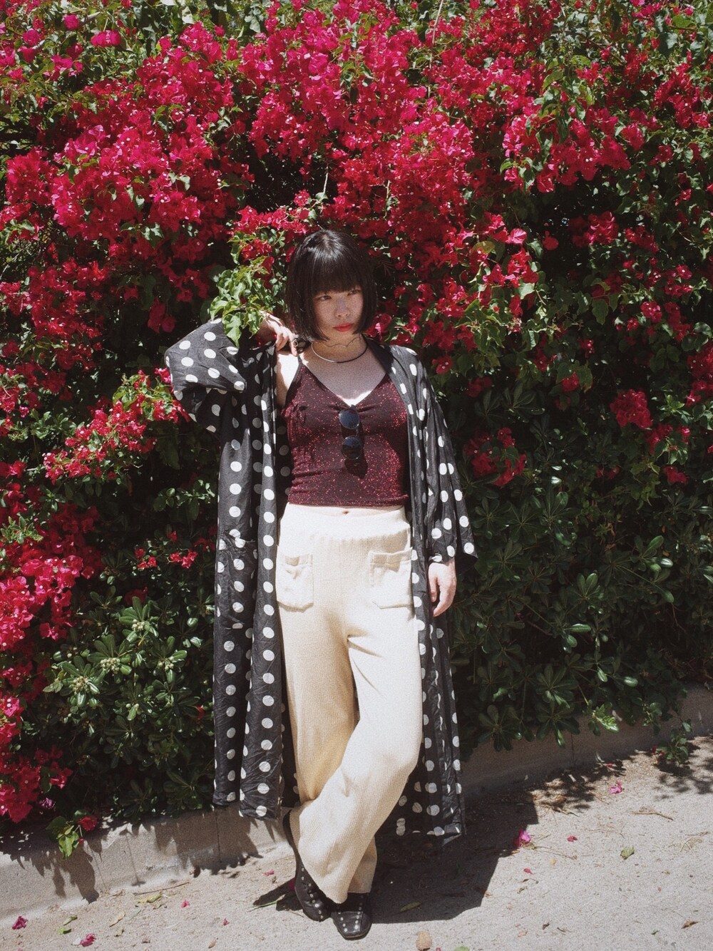米国2日目 ドットのシルクのガウンは 旅行にぴったり 赤いラメのキャミソールにアカネウツノミヤの ジャージパンツ