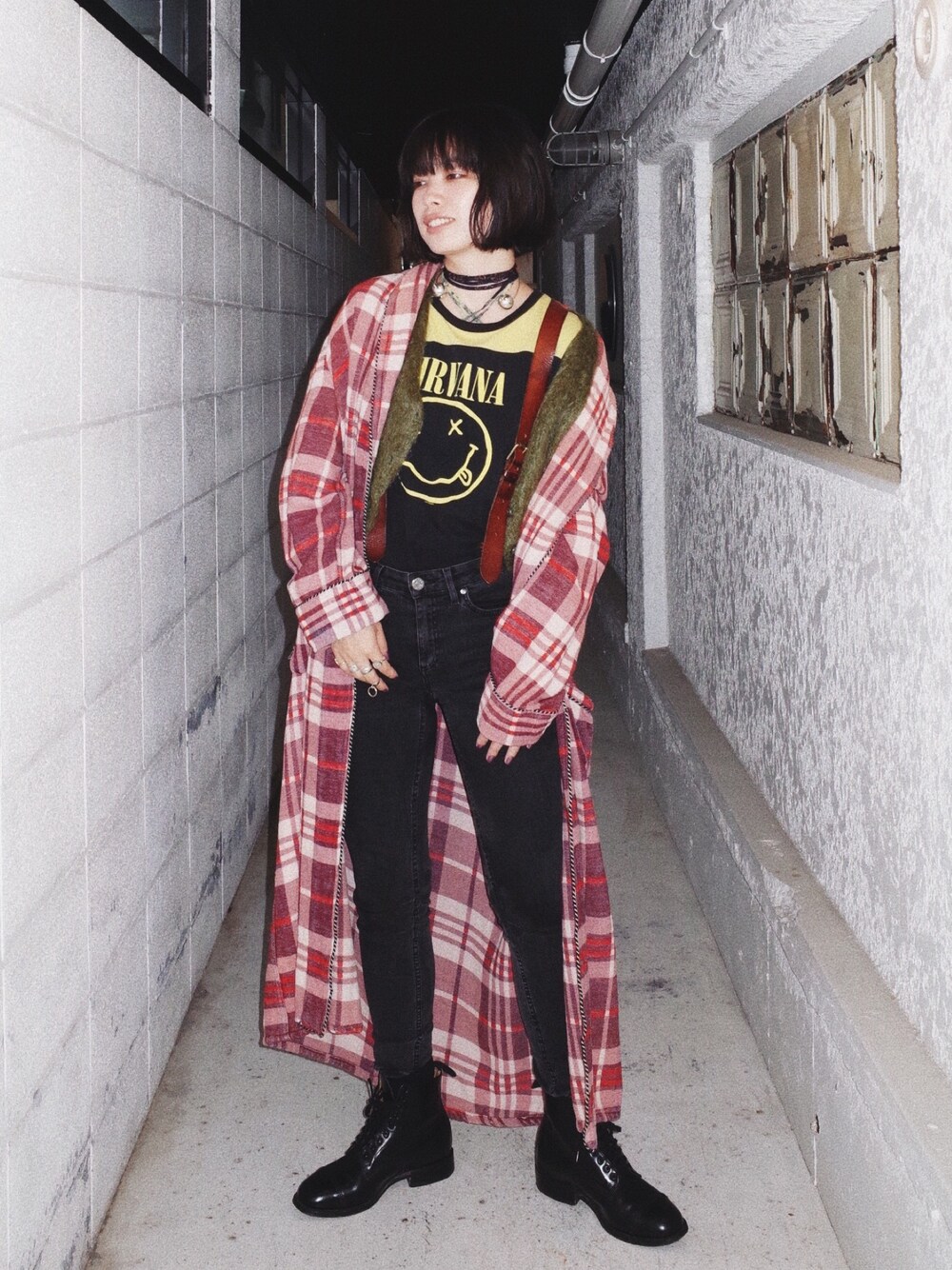 NIRVANAのビンテージTシャツ なもんで モヘアカーディガンにチェックネルガウンに ブラックジーンズで グランジ意識の日でした🤓