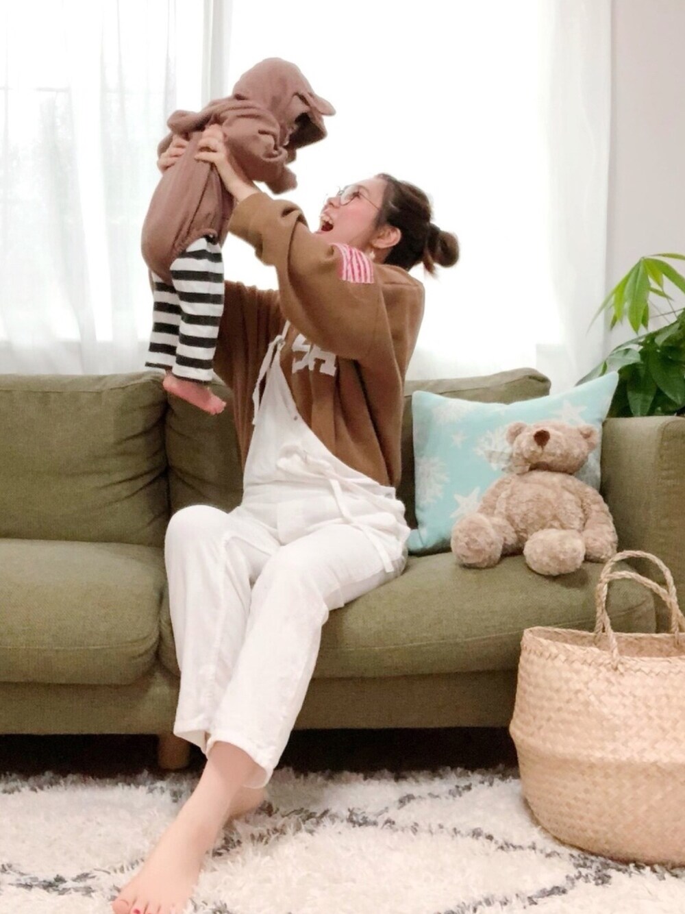 #おうちファッション 🏡✨ 👶と撮ってみました❤️ ブラウンでちょっとリンクコーデ🐻💕 IKEAのカゴに入ってるのは… オムツ🤣❤︎笑 baby... くまロンパース 韓国ベビー服 ボーダーパンツ bebe