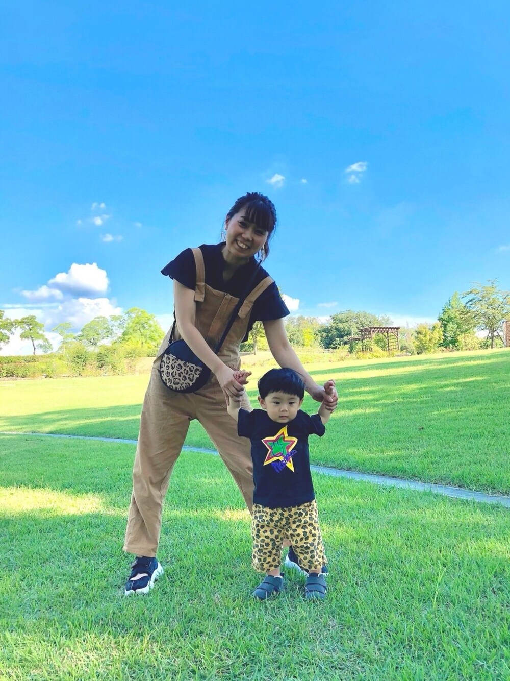 逆光でなんとか画質明るくしようとしたら、こんな感じになっちゃった😂 なんとなく色味を息子と合わせてみました❤️🦁✨ アニマル親子🤣 息子はただ今歩く練習中! まだ全然歩かないけど💦