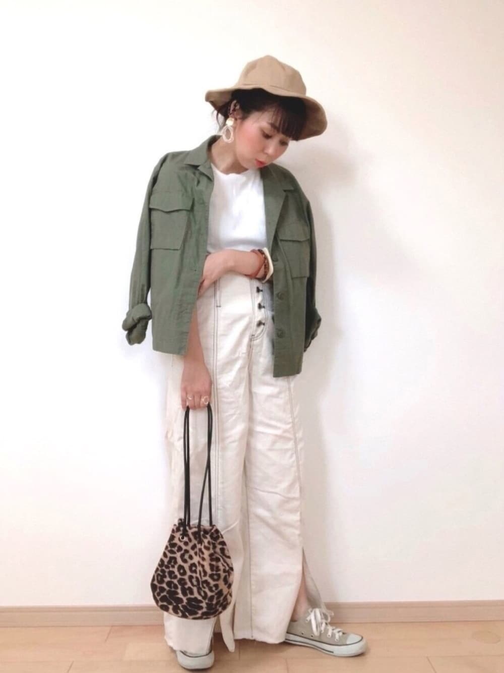 ゆうちゃんとのリンクコーデ第2弾😆💓 ホワイトベースに、カーキジャケット🧥💚 ゆうちゃんのカーキジャケットがめちゃめちゃ可愛いんだよなぁ😍❤️ タイプ🤤💕 私はバケハ合わせにしてとことんカジュアルにしました😆!