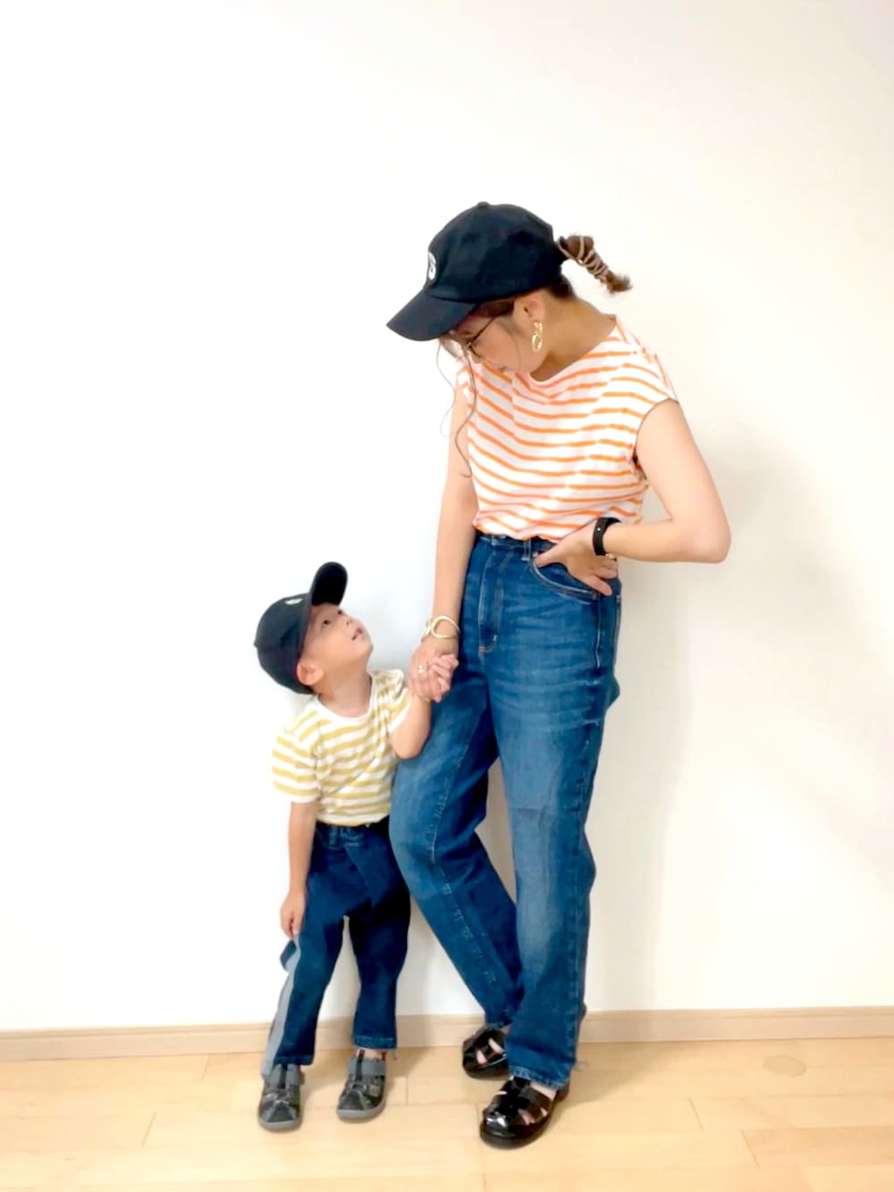 カラーボーダーとデニムでリンクコーデ👖😍💓 ママも息子もトップスは @grshimamura のもの🥰 明るい色大好き🌈💛 デニジャケ羽織って、 #デニムオンデニム でも可愛いよね😩❤️