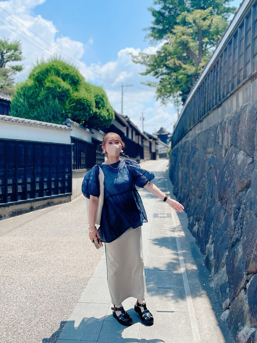 子供を預けてお友達とぷらっと女子旅🥰💕 母ちゃんの息抜き😇✨ コーデはまたしまむらのめぐみさんコラボのラインスカートを着用しました😆 ラインスカートは絶対getしたい!!って思っていたもの❤️お友達も可愛いって褒めてくれたよ😍 ラインの配色が神がかってる✨ Mサイズ履いてるよ🌻 お気に入りの @american_holic のドットブラウスをラインスカートに合わせた、ちょっと一癖あるコーデになりました💫