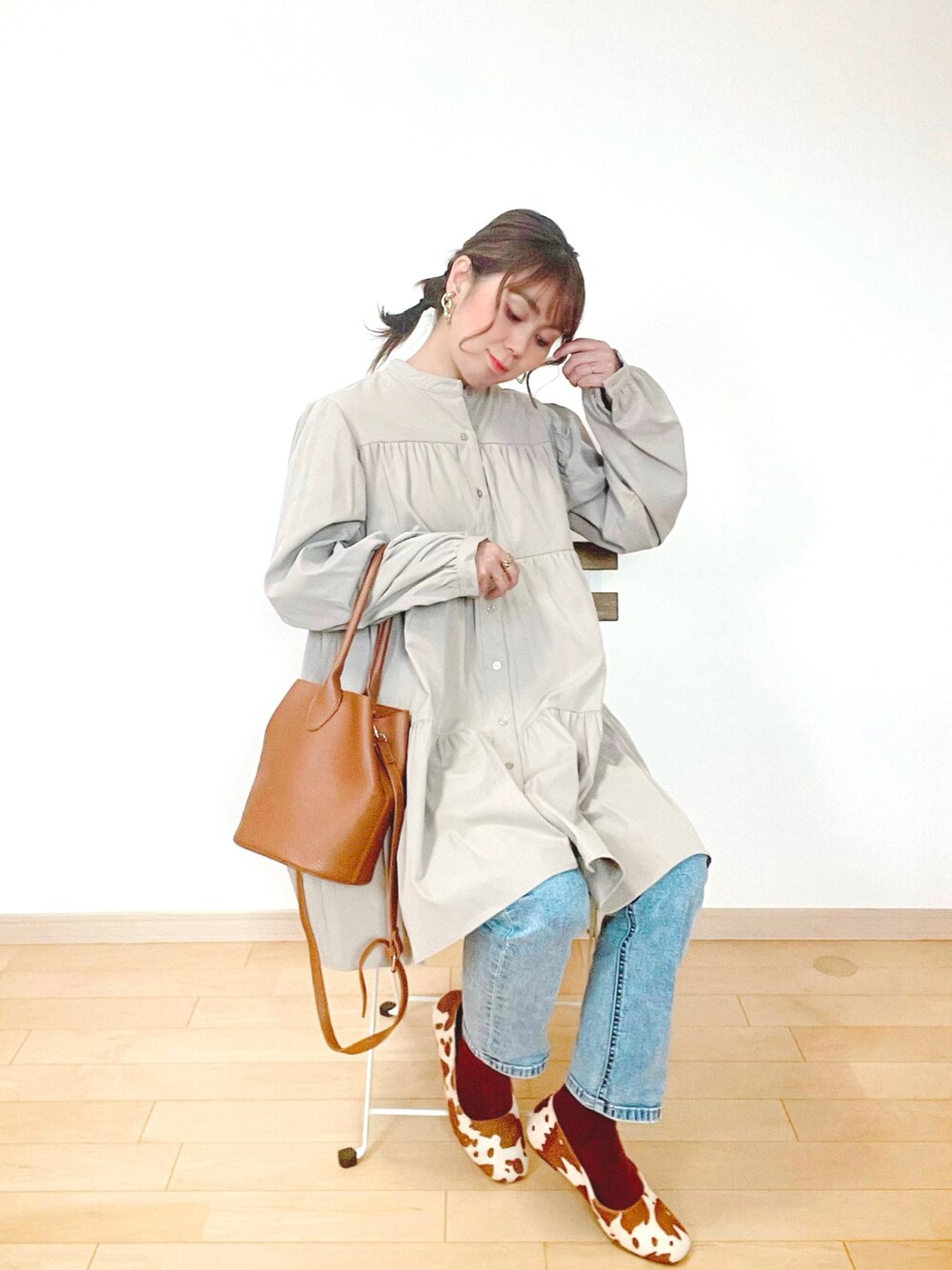 保育園の先生に、このパンプス合わせを褒められたコーデ😂🐄❤️ 久々にティアードブラウスをチョイス☺️ これまた全身しまむらコーデなのでした🤣✌️ 秋になるとカラーソックス合わせもしたくなる季節🧦 今日は赤ソックスな牛柄パンプスでパンチを効かせたよ😍 ちなみにパンプスはワンコインの🪙 🏷️ @hiraki_official さんのです🤣激安!!✨