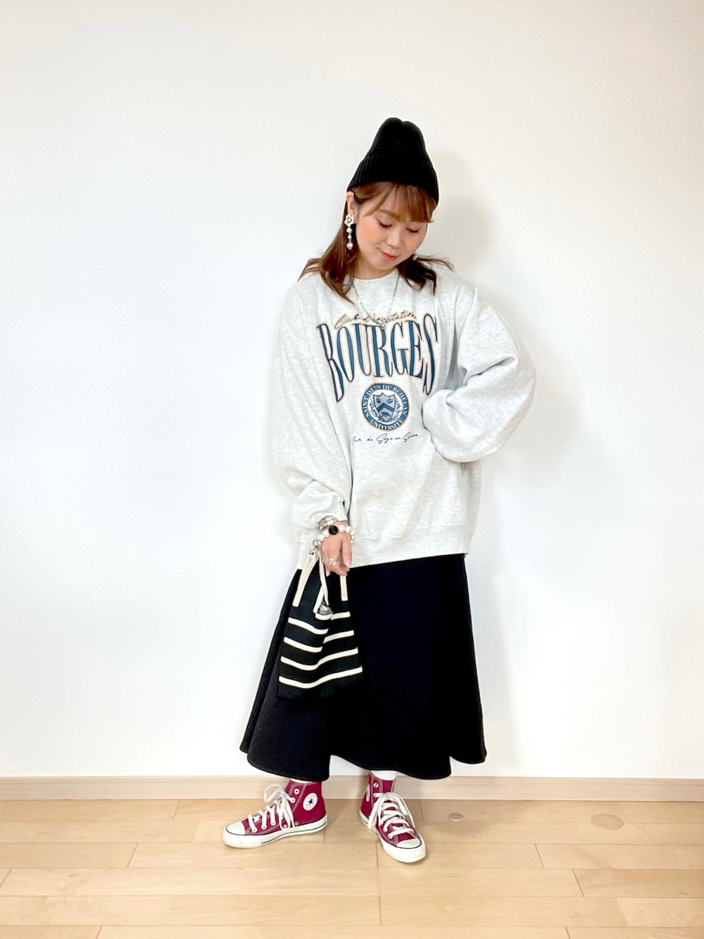 去年大変お世話になった @discoat_official のスウェット😍 これ大好きで今年も沢山着ちゃうぞ🫶 裏起毛だしあったかいのよねぇ🥹🔥 久々にマーメイドスカートなんか履いちゃったりして🧜 足元は赤コンで差し色👟🍎 好きなカジュアルコーデでした😊 アクセは最近好きなシルバー合わせで⛓️🩶🫶