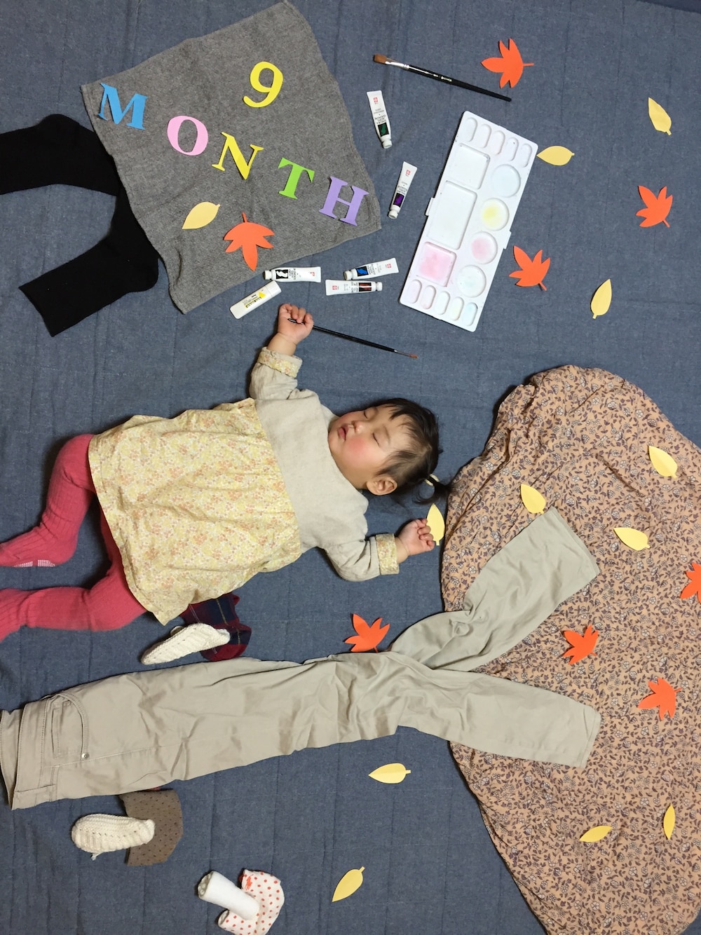 今日で9ヶ月になりました\(^o^)/ ハンドメイドのお洋服は美濃羽まゆみさんの型紙を元にして、折り返しの袖と後ろのボタン、髪の毛のゴムをスカート部分と同じ花柄で♡