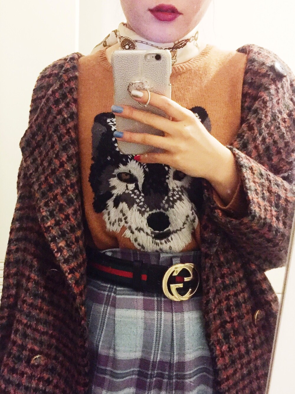 GUCCIのギークな世界観を意識して。 チェックオンチェック、シェリーラインのベルト、スカーフと柄を重ねてダサかわ。