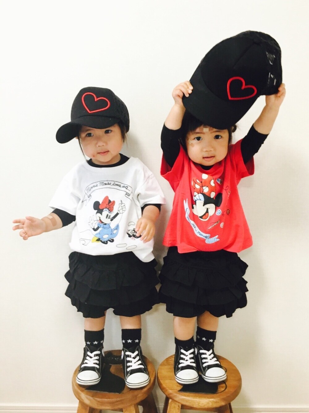 覗いて下さり👀✨ ありがとうございます☺💕 お返事前にごめんなさい💦 あとでゆっくりまわらせてもらいます😆 ユニクロにグレーミッキー見に言ったのに・・・ 気がつけば手にとっていた赤のミニー😅 ボトムはスカッツです☺ マーキーズで購入しましたが、可愛くてしっかりめの生地👌 キャップはキッズのフリーサイズです⭐️ デカすぎて、びよ〜〜ん🤣