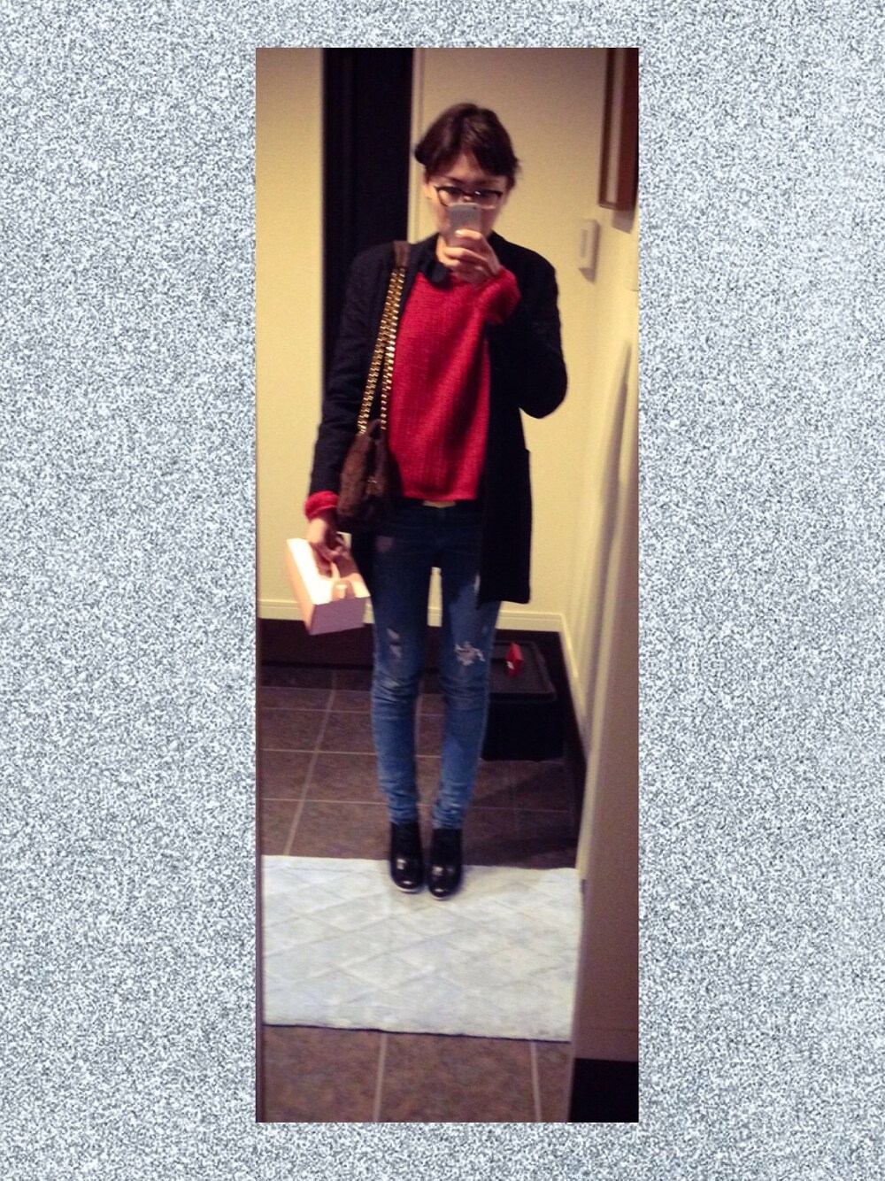 中に着た黒シャツ anap ニット AZUL by moussy デニム ZARA コート Salvatore Ferragamo バッグ PRADA ブーティ しまむら メガネ vivienne westwood