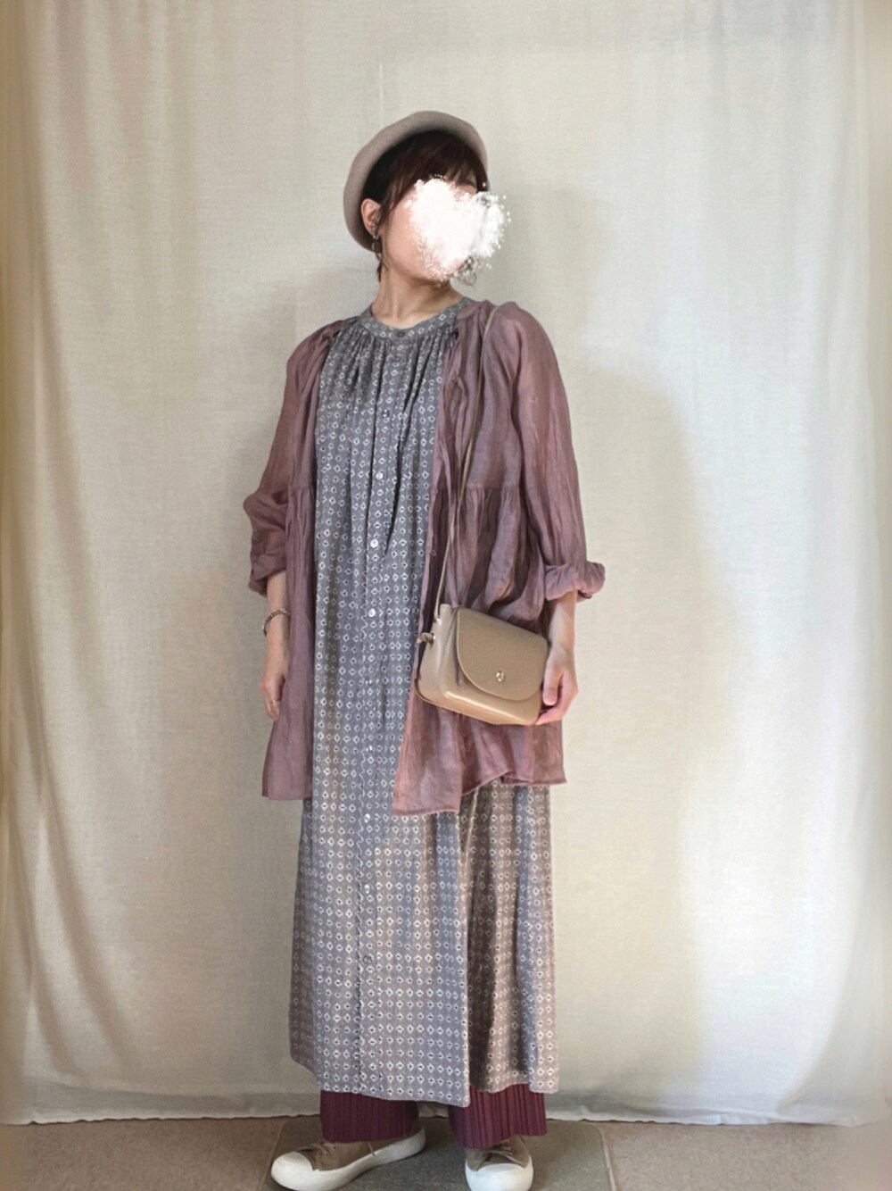 こんにちは♪見ていただき、ありがとうございます! いいね、お気に入り、フォロー、とってもうれしいです♪ 前回のコーデをフォルダインしていただきありがとうございます😊 mic@さん✨ ぱぱさん✨ aomiiさん✨ 10月2日 ⛅️31℃/15℃。 日中は暑くなりました。 これからワクチン接種2回目です💉 ノースリーブにシアーブラウスを羽織りました。 お気に入りのワンピとベリーっぽい色味でコーデ。 ローズボリュームチュニック グレー小紋柄プリントワンピース ピンクプリーツパンツ ブラウンスニーカー ブラウンミニショルダー ベージュバスクベレー ビジューブレスレット グレーフロッキーパールイヤリングを合わせました。