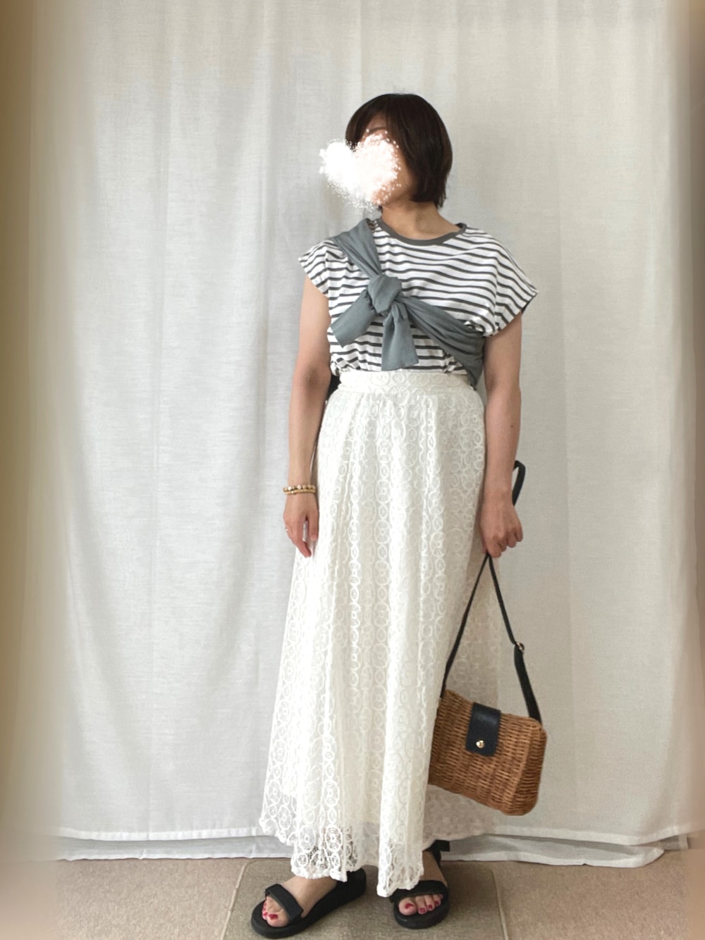 こんにちは♪見ていただき、ありがとうございます! いいね、お気に入り、フォロー、とってもうれしいです♪ 前回のコーデをフォルダインしていただきありがとうございます😊 ケンさん✨ ひろ★さん✨ MR.Mさん✨ mic@さん✨ Kyoさん✨ 6月21日 ☁️30℃/22℃。 蒸し暑い日でした。 ボーダーT×レーススカート。 カーキシアーVネックカーディガン グレーフレンチボーダーT 白サークルレーススカート 黒スポサン かごバッグを合わせました。