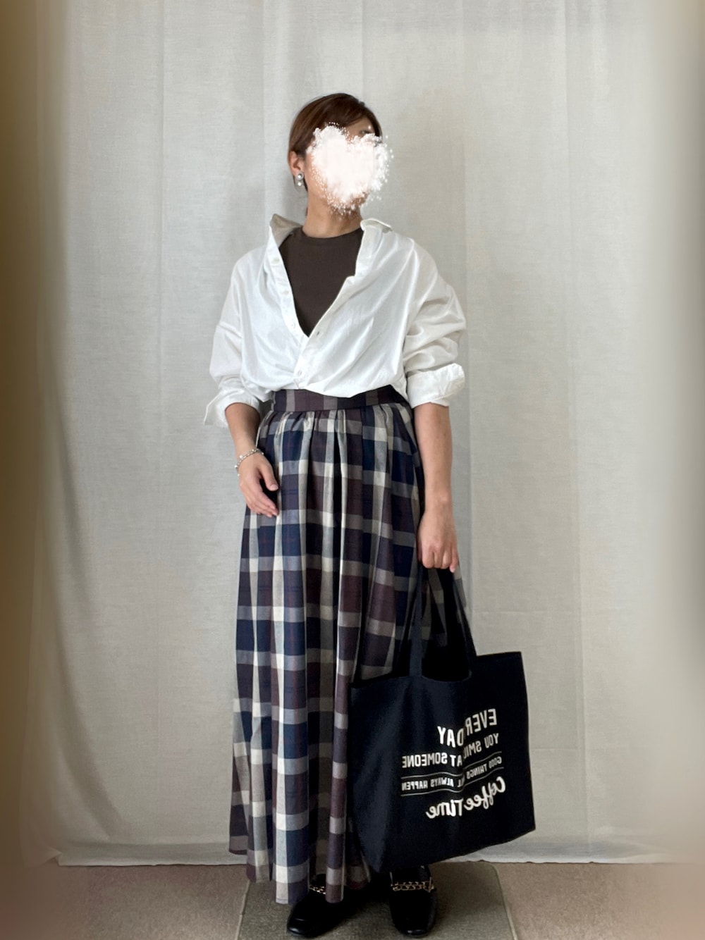こんにちは♪見ていただき、ありがとうございます! いいね、SAVE、フォロー、とってもうれしいです♪ 前回のコーデをフォルダインしていただきありがとうございます😊 ひろ★さん✨ 9月20日 ☁️☂️28℃/18℃。 風雨は弱まり。 午後から気温が下がってきました。 チェックスカート×白シャツ。 白コットンシャツ ブラウンスムーススリーブレスカットソー ネイビーチェックスカート 黒ローファー 黒トートバッグ ビーズブレスレット メタルパールイヤリングを合わせました。