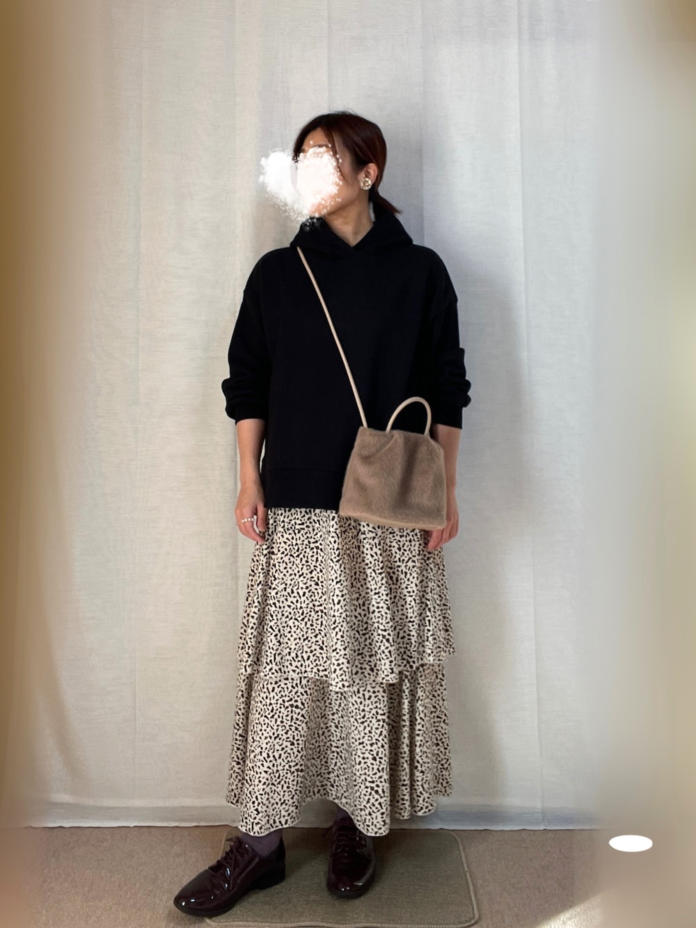 こんにちは♪見ていただき、ありがとうございます! いいね、SAVE、フォロー、とってもうれしいです♪ 前回のコーデをフォルダインしていただきありがとうございます😊 ひろ★さん✨ うさこちゃん✨ bochukunさん✨ Mr.Mさん✨ あかりん✨ 11月25日 🌤18℃/9℃。 過ごしやすいお天気。 パーカー×レオパード柄スカート。 黒パーカー 白レオパード柄ティアードスカート ワインレースアップシューズ パープル靴下 ベージュファーバッグ ゴールドビジューイヤリングを合わせました。