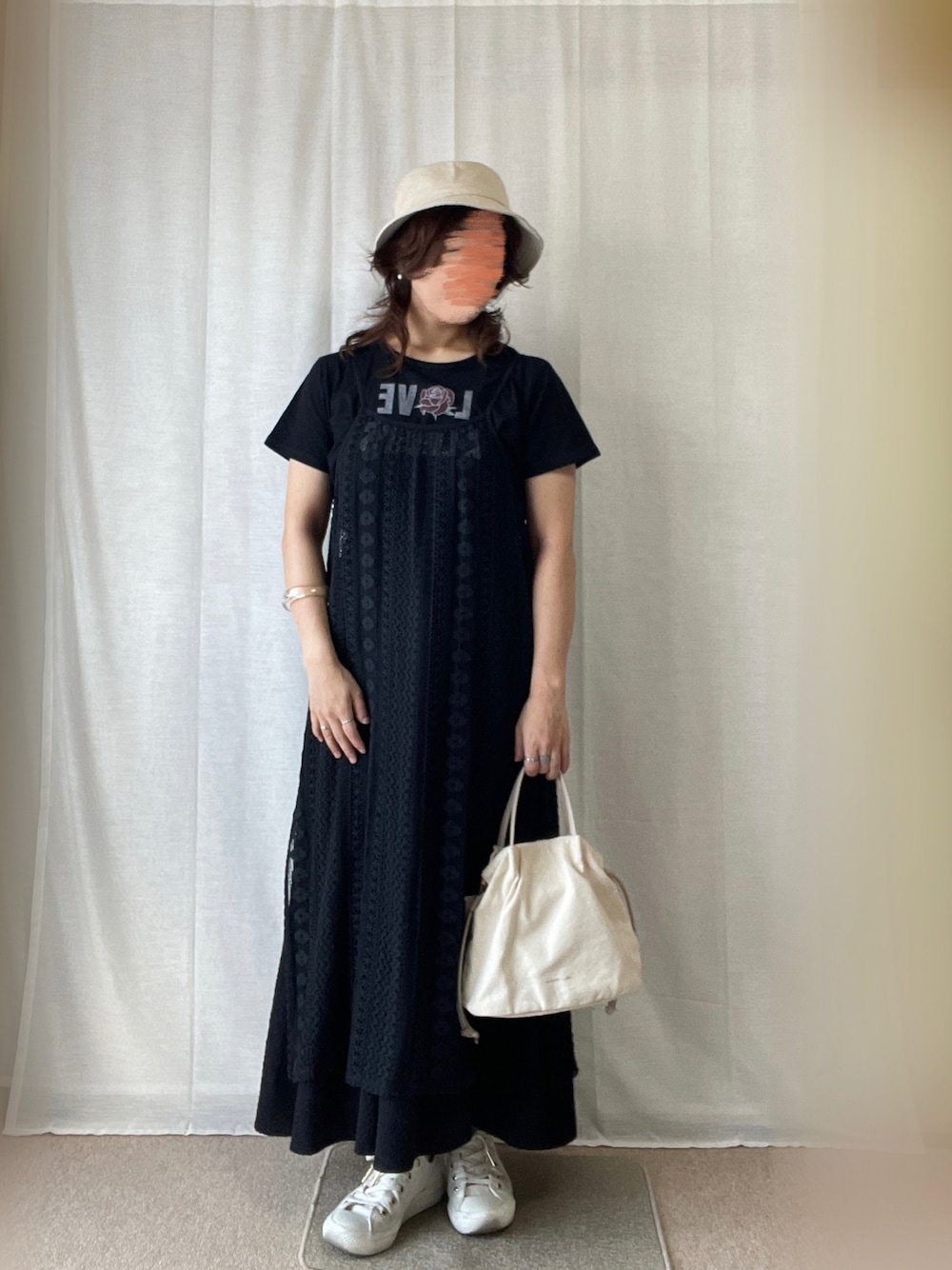 こんばんは♪見ていただき、ありがとうございます! いいね、SAVE、フォロー、とってもうれしいです♪ 前回のコーデをフォルダインしていただきありがとうございます😊 りく🎒さん✨ うさこちゃん✨ bochukunさん✨ ひろ★さん✨ Genさん✨ 8月10日 ⛅️34℃/25℃。 ロゴT×マーメイドスカートでブラックコーデ。 透かし編みキャミワンピをレイヤードしました。 黒透かし編みキャミワンピース 黒ロゴT 黒ギンガムチェックマーメイドスカート 白スニーカー 白巾着トートバッグ 白バケハ クリアバングル メタルパールイヤリングを合わせました。