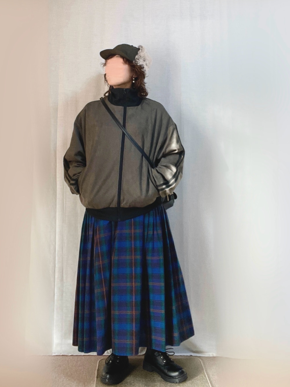 こんにちは♪見ていただき、ありがとうございます! いいね、SAVE、フォロー、とってもうれしいです♪ 前回のコーデをフォルダインしていただきありがとうございます😊 まっちゃんさん✨ bochukunさん✨ STOさん✨ たっくんさん✨ ひろ★さん✨ Genさん✨ 3月5日 ☂️9℃/4℃。 ひんやり雨の日。 過去コーデ。 トラックジャケット×チェックスカート。 フライトキャップ合わせました。 カーキトラックジャケット ネイビーチェック切替ギャザースカート 黒マニッシュシューズ 黒ミニボストンバッグ カーキフライトキャップ シルバーボールイヤリング