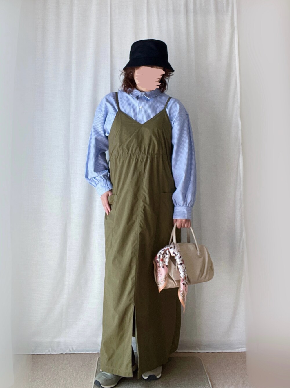 こんにちは♪見ていただき、ありがとうございます! いいね、SAVE、フォロー、とってもうれしいです♪ 前回のコーデをフォルダインしていただきありがとうございます😊 さりちゃん✨ ほのかりんさん✨ ひろ★さん✨ STOさん✨ Genさん✨ ゆりちゃん✨ bochukunさん✨ きょうちゃん✨ まっちゃんさん✨ たっくんさん✨ 4月5日 ☁️16℃/9℃。 ひんやりめな日。 まっちゃんさん主催#ネクタイフェスに参加します♪ ミリタリージャンスカにストライプシャツをイン。 バッグにスカーフを結びました。 pic2 別の日のコーデ。帽子とバッグを替えただけ。 ブルーストライプシャツ カーキミリタリージャンスカ カーキスニーカー アイボリーミニボストンバッグ 黒バケハ ゴールドパールイヤリング