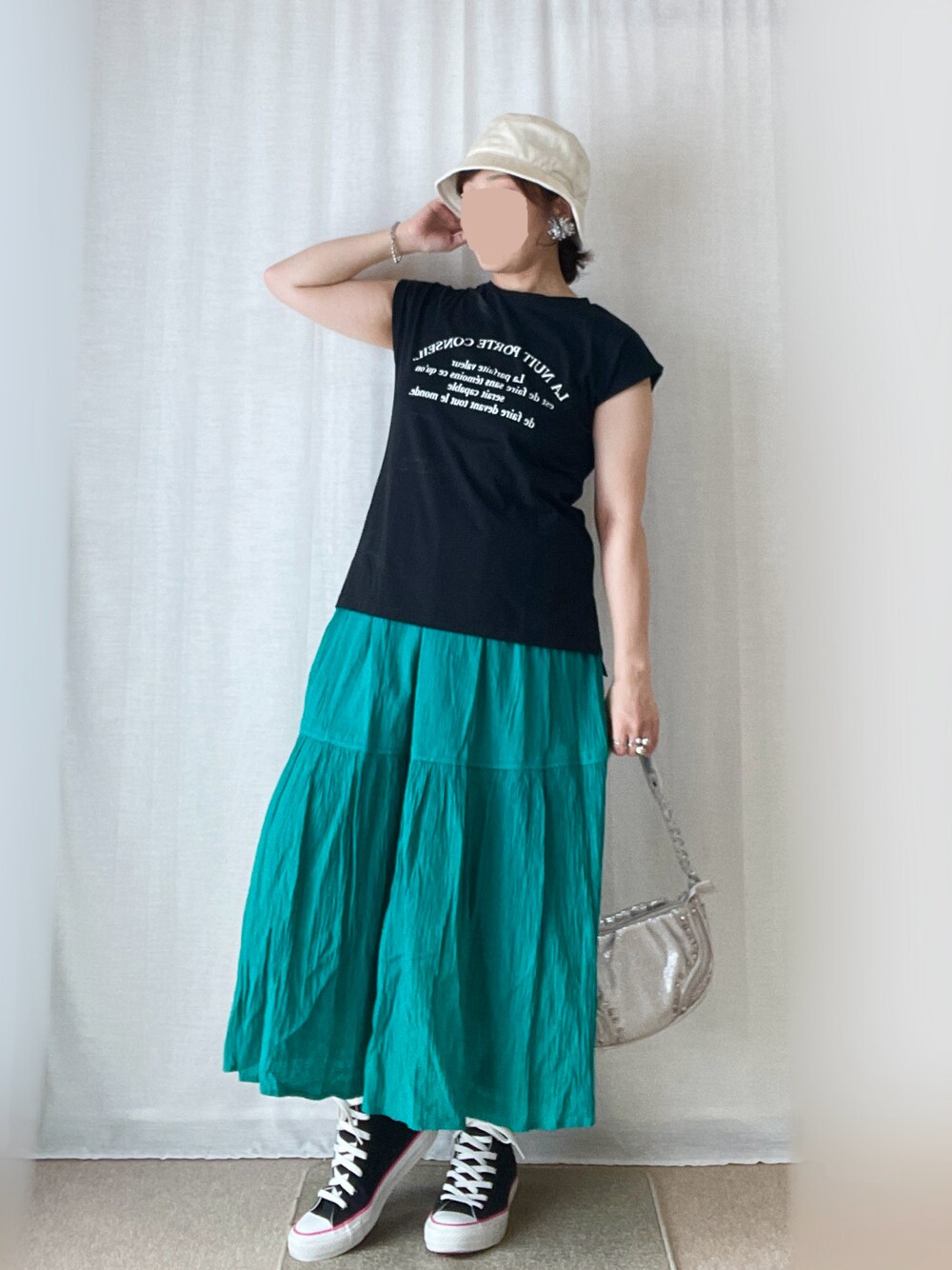 こんばんは♪見ていただき、ありがとうございます! いいね、SAVE、フォロー、とってもうれしいです♪ 7月16日 ☂️🌧️26℃/22℃。 梅雨っぽい雨の日。明日からまた気温上がるとか。 週末コーデ。 ロゴT×ティアードスカート。アクセはシルバーで涼しめに。 これにUVカットアウターを羽織りました。 黒ロゴT グリーン楊柳ティアードスカート 黒ハイカットスニーカー シルバースタッズラインストーンショルダーバッグ 白バケハ シルバーボールブレスレット シルバーメタルボールリング シルバーパールメタルイヤリング