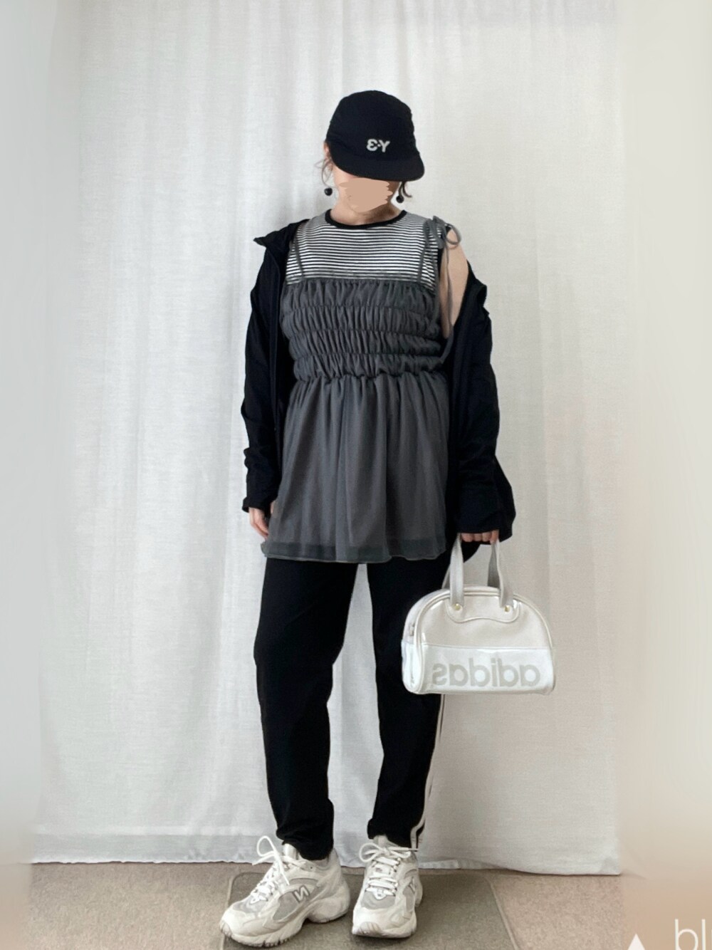 見ていただき、ありがとうございます! いいね、SAVE、フォロー、とってもうれしいです♪ 7月31日 🌤️→☔️35℃/27℃。 夕方、外が白く見えるほどの激しい雨と雷⚡️ 昨日のコーデ。 スポーティ×モードストリート風。 チュールビスチェでふんわりさせました。 黒ラッシュガード グレーチュールビスチェ ボーダーフレンチスリーブカットソー 黒ラインパンツ 白スニーカー ライトグレーadidasバッグ 黒ロゴキャップ 黒チェリーイヤリング