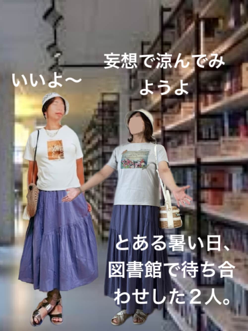 見ていただき、ありがとうございます! いいね、SAVE、フォロー、とってもうれしいです♪ 8月12日 🌤️37℃/28℃。 🍧真夏のかき氷フェス ※最終日! 🍧似たものあわせっこ 🍧暑さから逃避!ラベンダー畑で涼んじゃおう味?🍧 ゆみっつと、お揃いのパープルスカートであわせっこ。 ゆみっつ、楽しい企画をありがとう!そしてあわせっこしてくれてありがとう😊 というわけで、妄想お出かけストーリーのはじまりです♪ 🍀溶けそうな暑さの中、図書館で待ち合わせた2人。 暑さで多少言葉がカタコトですが。妄想お出かけで暑さを忘れて涼んじゃおうという計画です。 妄想の中でさらに妄想。 図書館なので私語は控えめに、脳内で遊びまくります! 🍀まずはお花畑が広がる水辺をお散歩。きれいで心地よい空間に思わず深呼吸しちゃいます。この世のものじゃないみたい。 🍀滝からマイナスイオンたっぷり。上半期に溜めたストレスも、暑さ疲れも溶けて流れ落ちていくようです。 夏の間中ここに住んでいたい! Tシャツ濡れたのでお着替え。 🍀ラベンダー色の涼しい花畑を飛び回る2人。 似た色みのスカートが風を受けてひらひらと溶け込んでいきます。 最高の開放感! 楽しすぎて溶けちゃいそう😆 🍀日も傾き始めた図書館。本の挿し絵の中にはなぜか見覚えのあるコーデが…。 (小窓)そして図書館にいた2人は…?