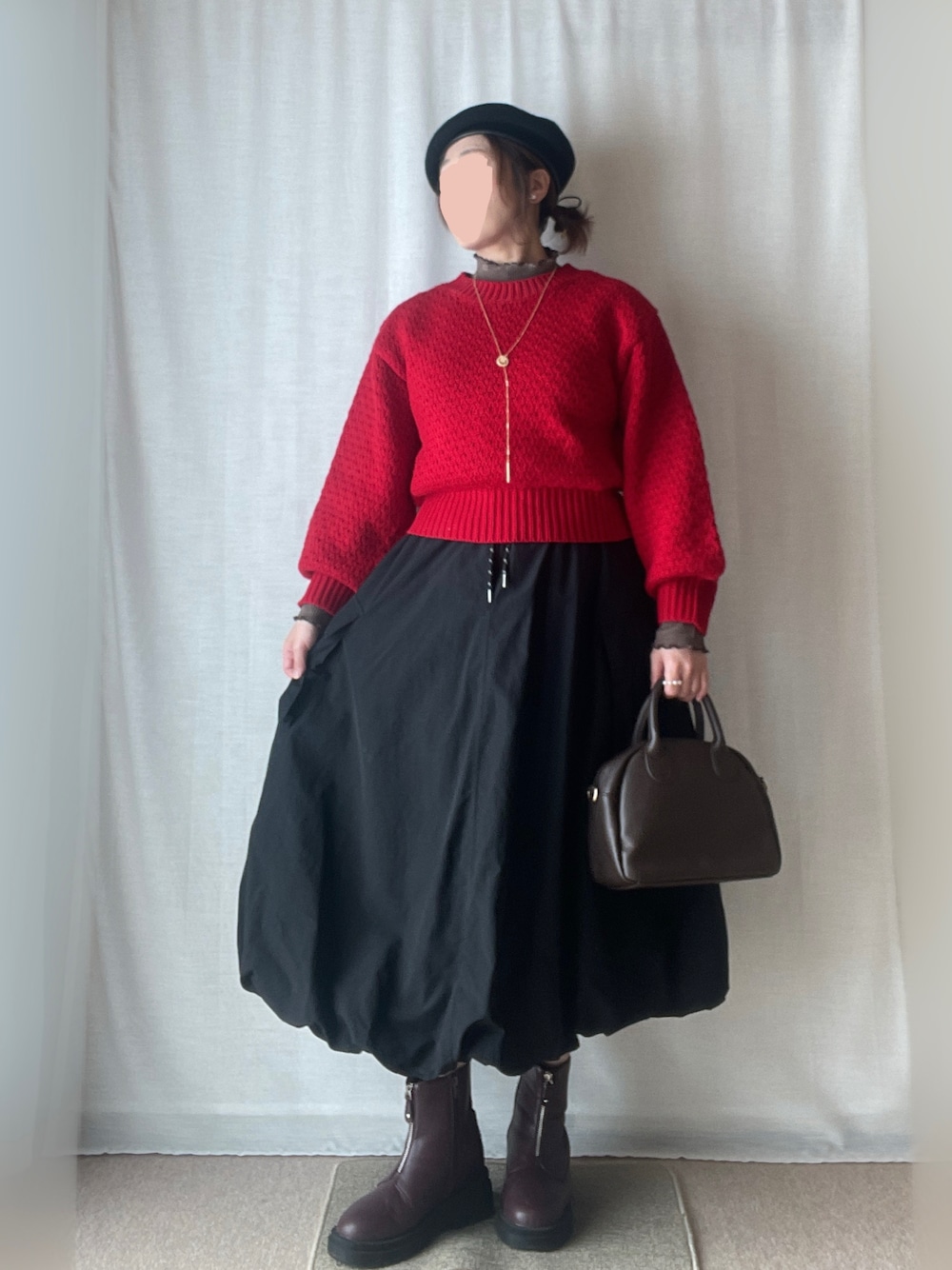 見ていただき、ありがとうございます! いいね、お気に入り、フォロー、とってもうれしいです♪ 2月14日 🌞14℃/マイナス1℃。 日中は暖かい日差し。 過去コーデ。 赤×黒×ブラウン。チョコっぽいイメージでコーデしました。 赤ポコポコジャガードニット ブラウンリブメローカットソー 黒バルーンスカート ボルドーセンタージップブーツ 黒ベレー ブラウンスクエアバッグ ゴールドコインスライドネックレス パールビジューイヤリング