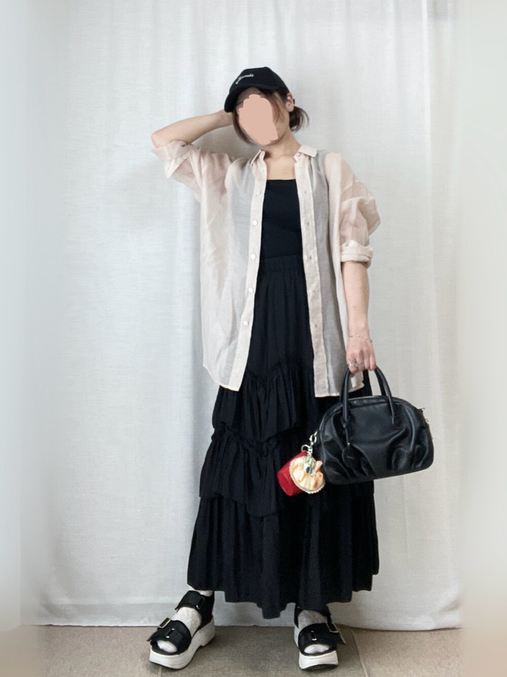 見ていただき、ありがとうございます! いいね、お気に入り、フォロー、とってもうれしいです♪ 5月21日 🌤️31℃/19℃。 ちょっとボーッとする感じの暑さ。扇風機はまだ我慢。 黒多めのモノトーンにシアーシャツ。 バッグにマグカップチャームを合わせました。 ベージュシアーシャツ 黒リブタンクトップ 黒ランダムティアードボリュームスカート 黒スポサン オフホワイト靴下 黒ミニボストンバッグ(マグカップチャーム) 黒ロゴキャップ クリアビジューフラワーイヤリング
